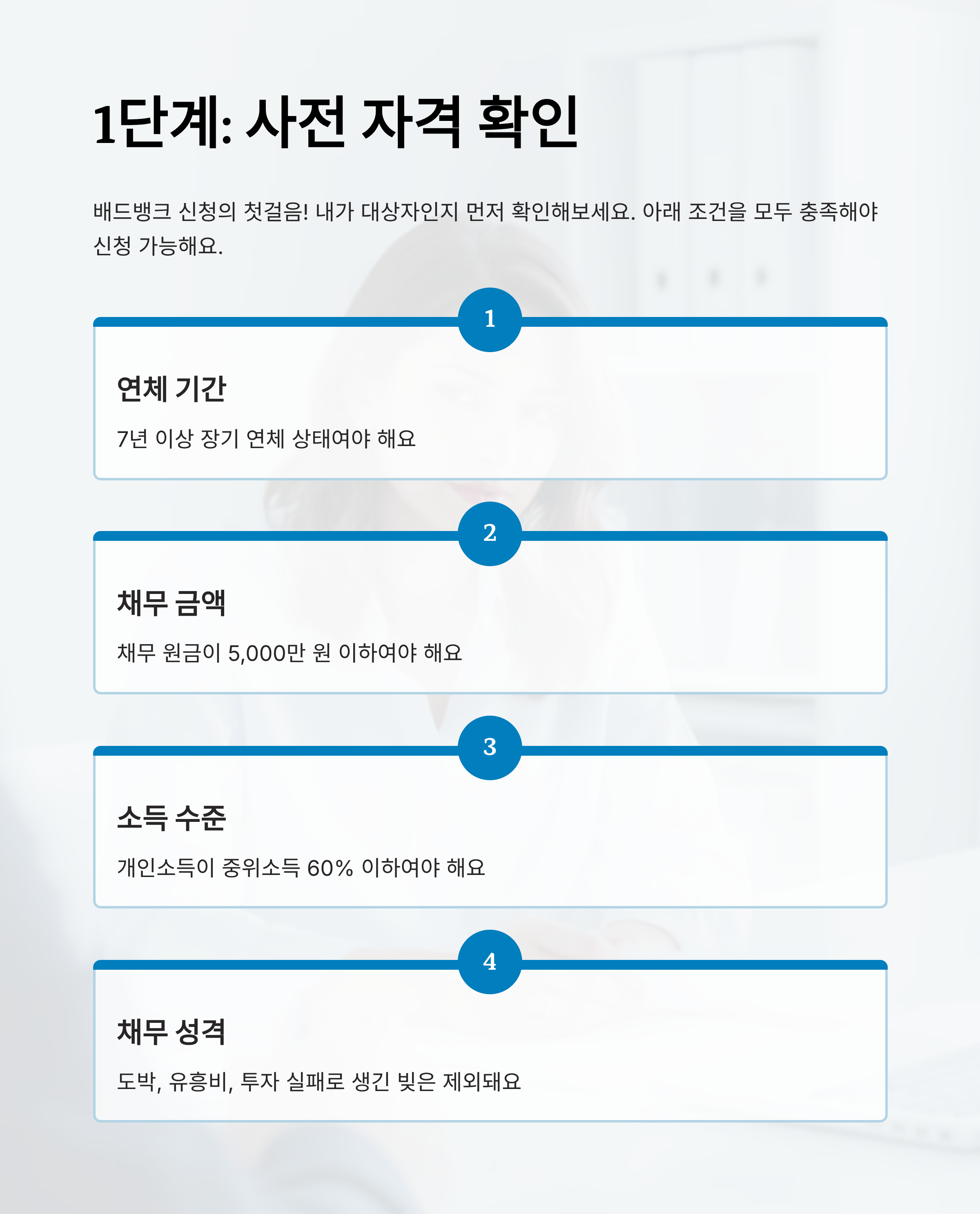 배드뱅크 신청의 가장 첫걸음은 내가 대상자인지를 판단하는 거예요. 아무나 신청할 수 있는 게 아니고, 몇 가지 조건을 모두 만족해야 해요.