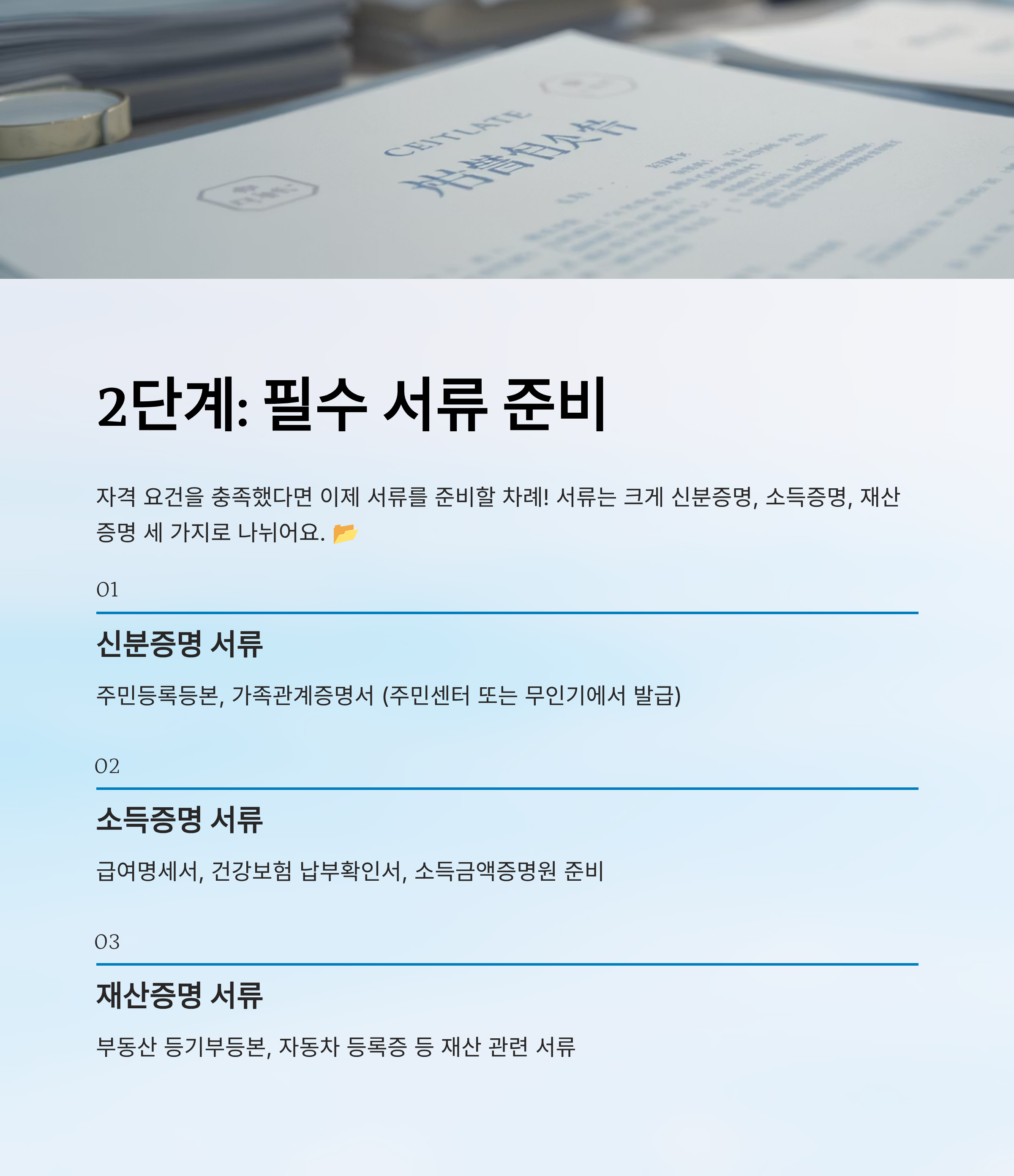 | STEP 2 | 서류 준비 (주민등록등본, 소득증명, 재산증명 등) |