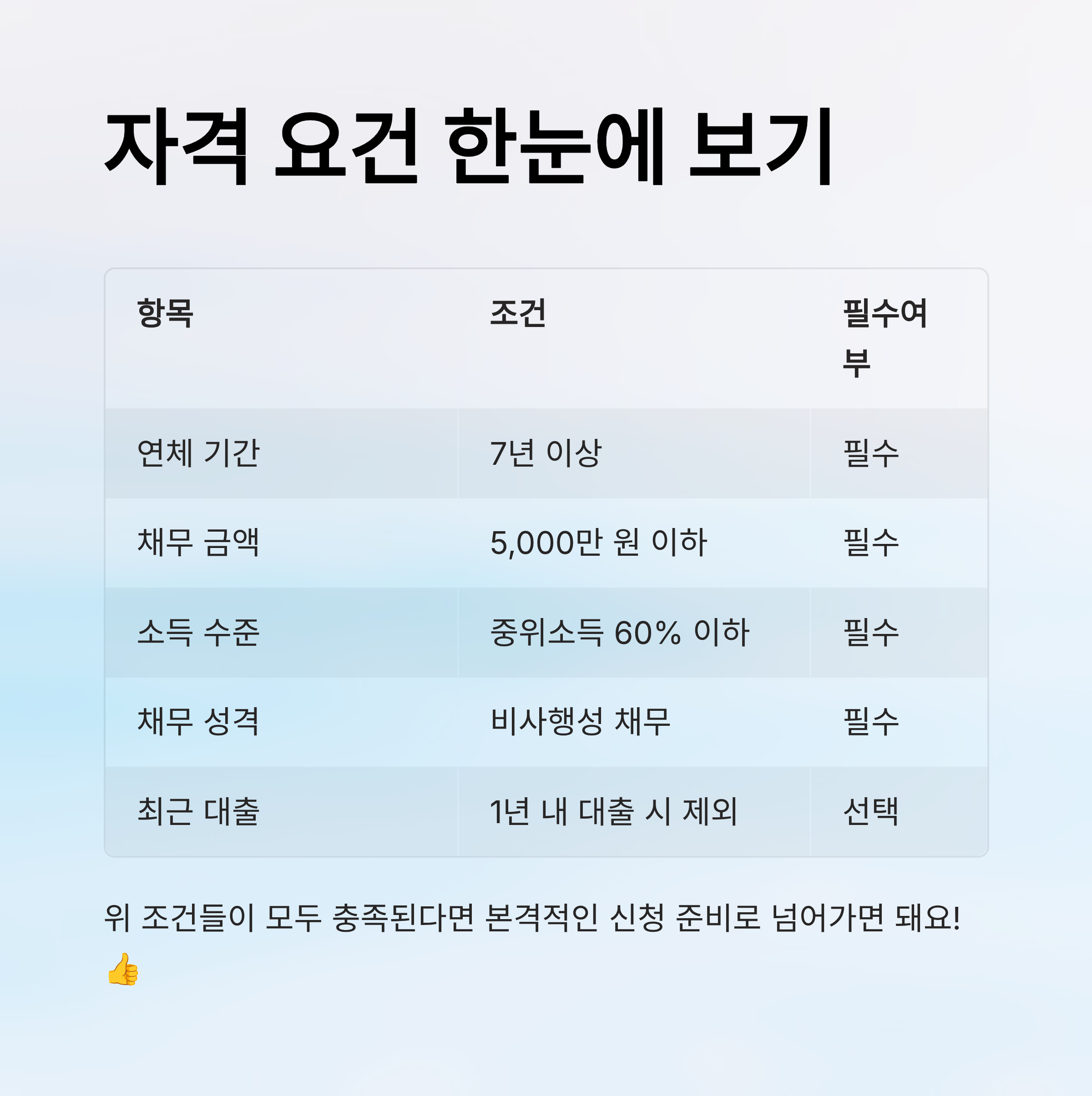 그 외에도 허위 소득신고, 재산 은닉, 상환능력 충분 등은 신청 제외 사유가 되니 반드시 확인해야 해요. 아래 표에서 핵심 조건들을 한눈에 정리해봤어요. 🔽