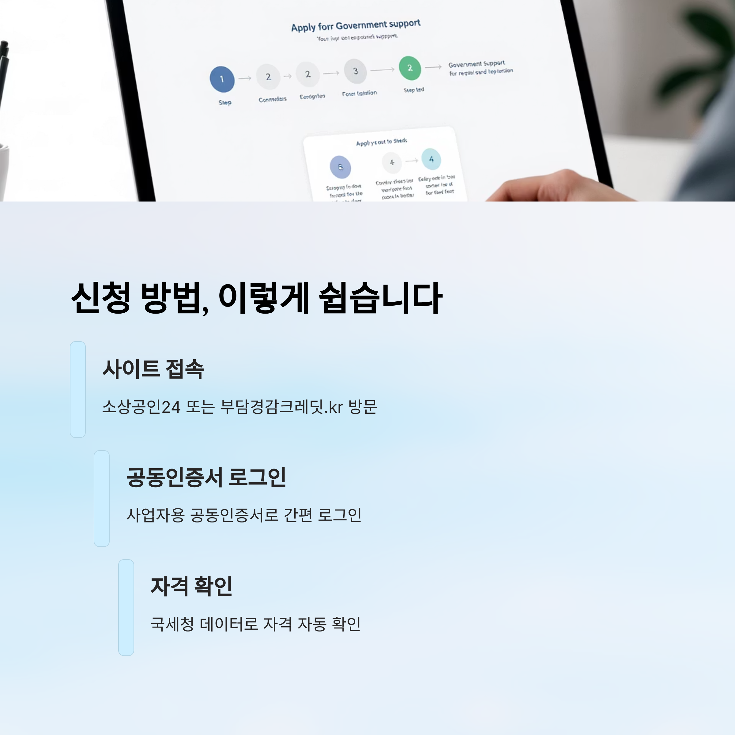 부담경감 크레딧 신청은 전적으로 온라인으로 진행되기 때문에, 누구나 집이나 매장에서 간편하게 할 수 있어요. 핵심은 ‘공동인증서 로그인’이에요. 사업자용 공동인증서만 있다면 복잡한 절차 없이 순식간에 신청 가능하답니다.