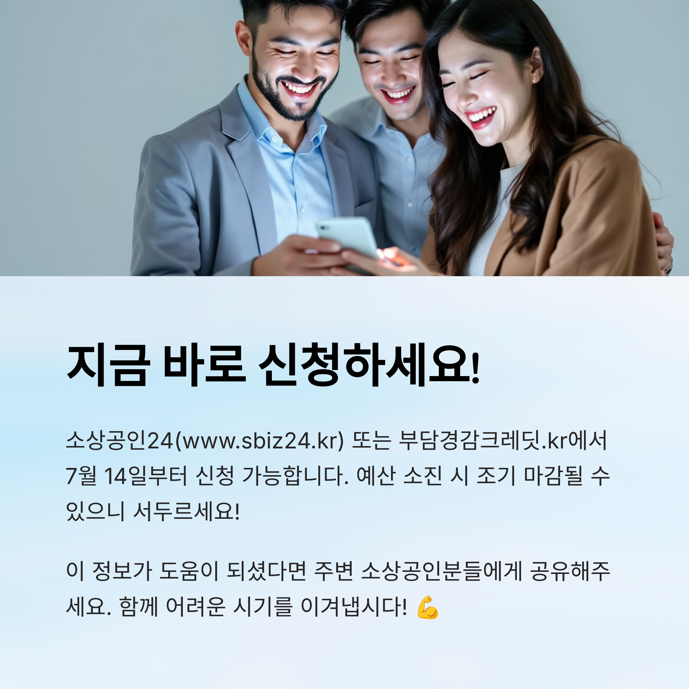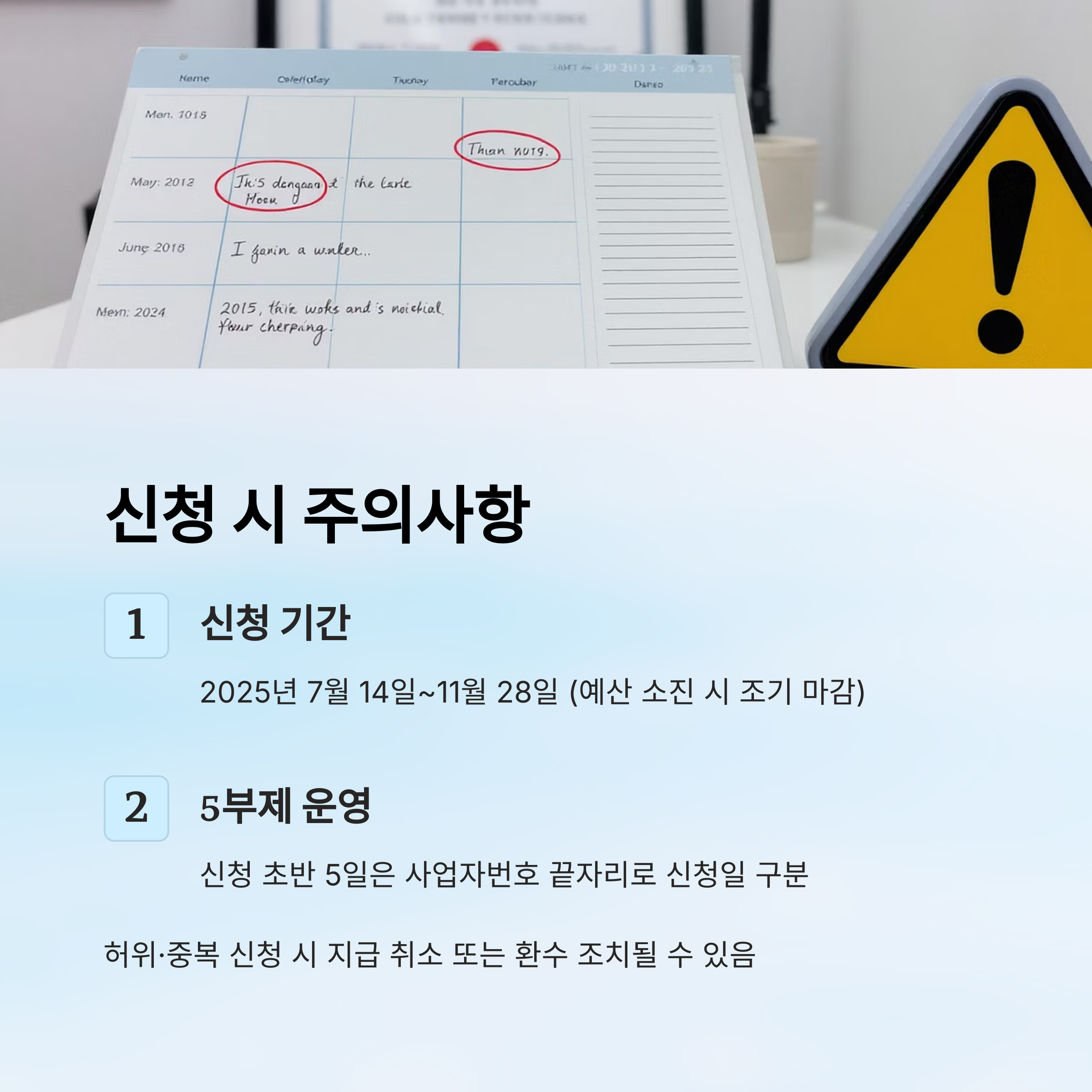 신청 초기에 접수자가 몰릴 수 있으니, 신청 시작일인 7월 14일 이후 가급적 빨리 신청하는 걸 추천해요. 특히 첫 5일은 사업자등록번호 끝자리로 신청 순서를 나누는 ‘5부제’가 적용돼요.