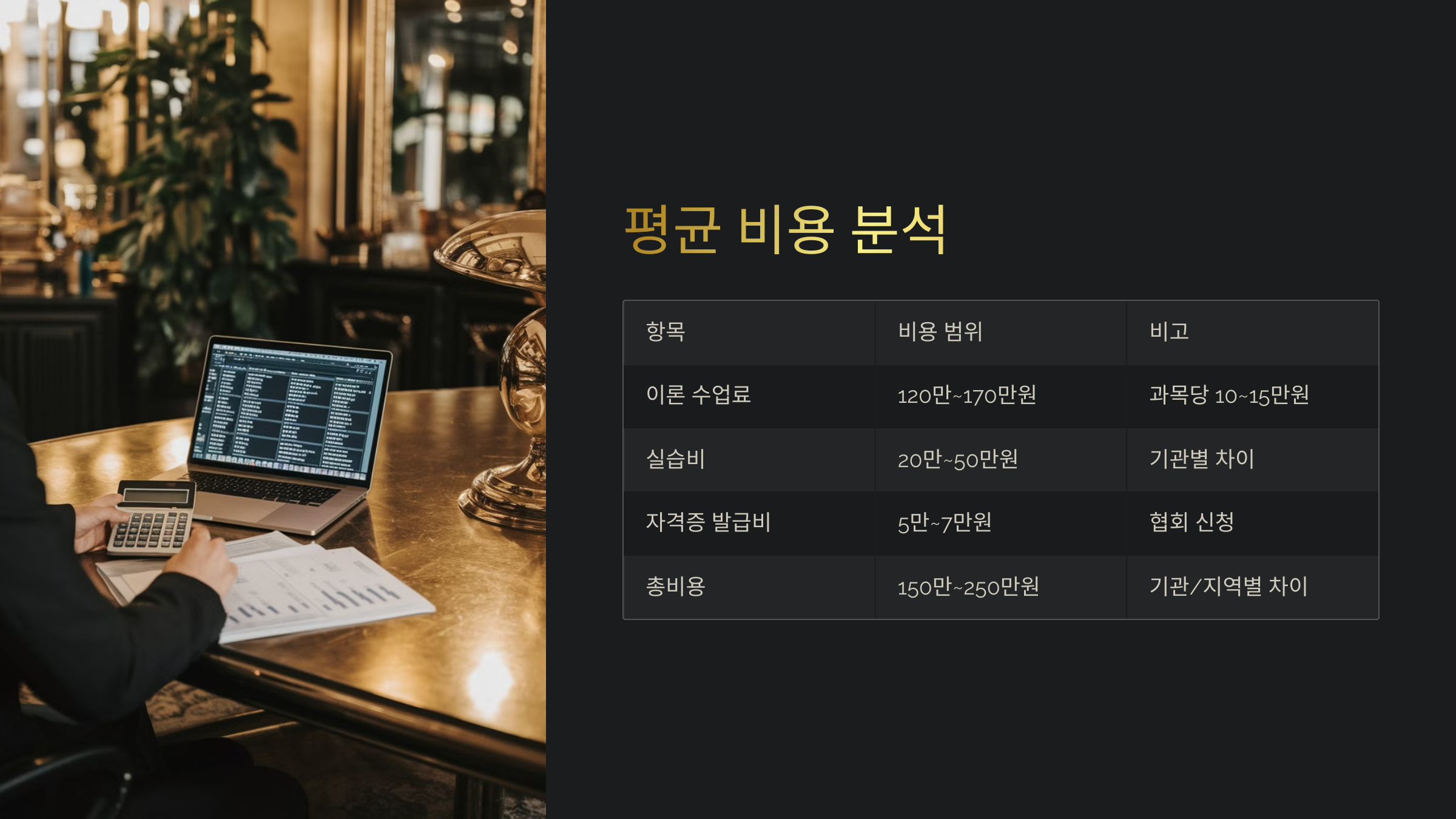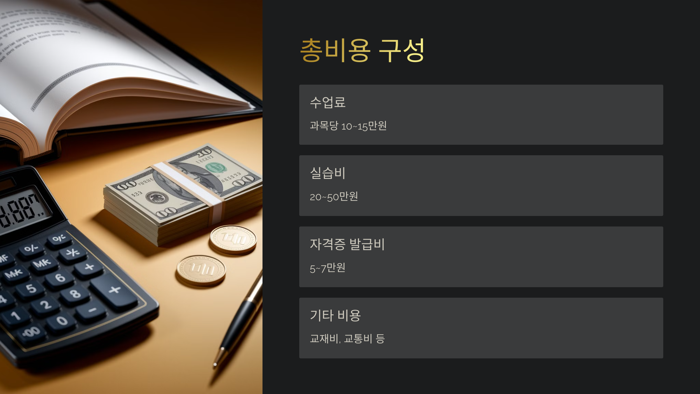 ✔ **이론 과목 수업료** → 160만~240만 원 ✔ **실습비** → 20만~50만 원 ✔ **자격증 발급비** → 5~7만 원 ✔ **기타 비용** → 10만~30만 원 ✔ **총 예상 비용** → 최소 150만 원~최대 300만 원