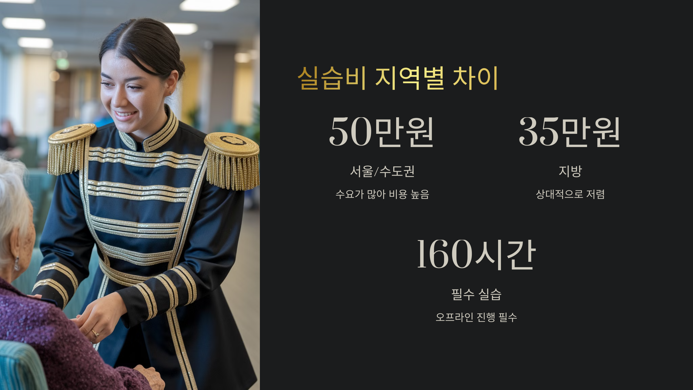 ✔ **실습 160시간 필수 (온라인 과정 없음, 오프라인 진행 필수)** ✔ **기관에 따라 실습비 차이 있음 (20~50만 원)** ✔ **지방이 수도권보다 저렴한 경우 많음**