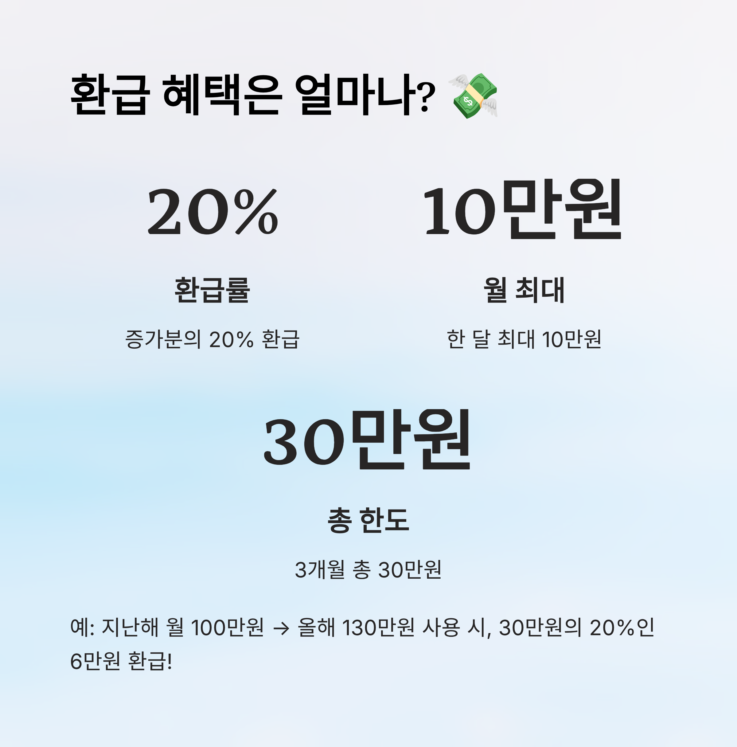 | 환급 비율 | 지난해보다 늘어난 카드 사용액의 20% | 실질적 체감 가능 |