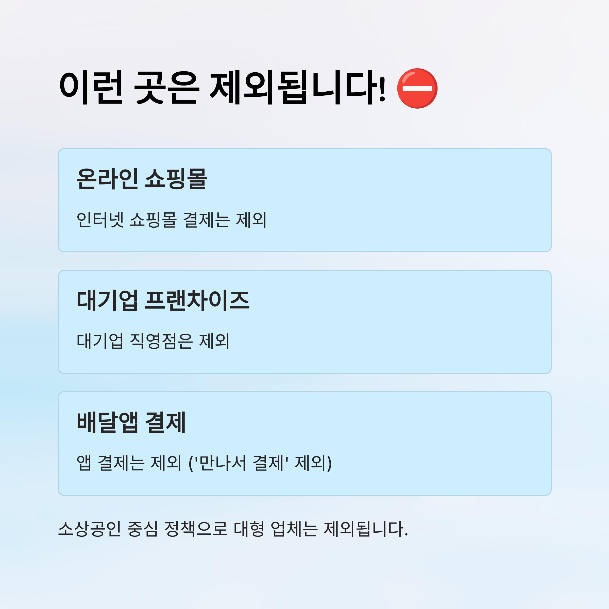 또 하나 주목할 점은, 상생페이백은 지역 제한이 없다는 거예요. 소비쿠폰이 특정 지역에 국한되던 과거와 달리, 상생페이백은 전국 어디서나 실적이 인정돼요. 대신 대기업 직영 프랜차이즈나 온라인 쇼핑몰 같은 대규모 업체는 제외되어 소상공인 중심으로 혜택이 돌아가도록 설계된 점이 차별화된 요소예요.