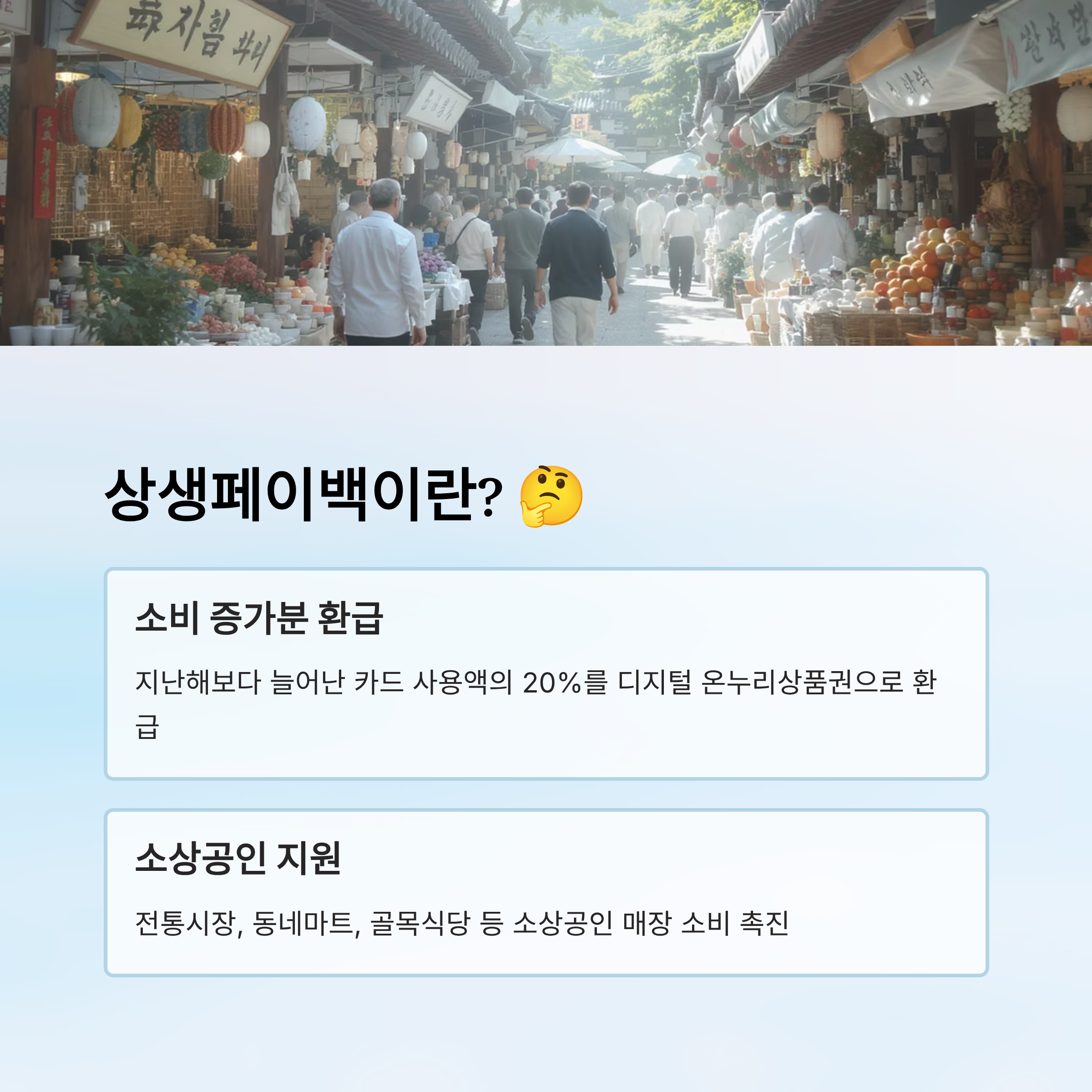 상생페이백의 또 다른 배경은 소비 행태 변화에 대응하려는 목적도 포함돼요. 코로나19 이후 온라인·비대면 소비가 급격히 늘었지만, 전통시장과 오프라인 상권은 오히려 침체됐어요. 정부는 이를 균형 있게 회복시키기 위해 오프라인 중심의 소비 촉진을 설계한 거예요. 즉, 디지털 시대에 오히려 ‘현장 경제’를 살리는 거죠. 🏪