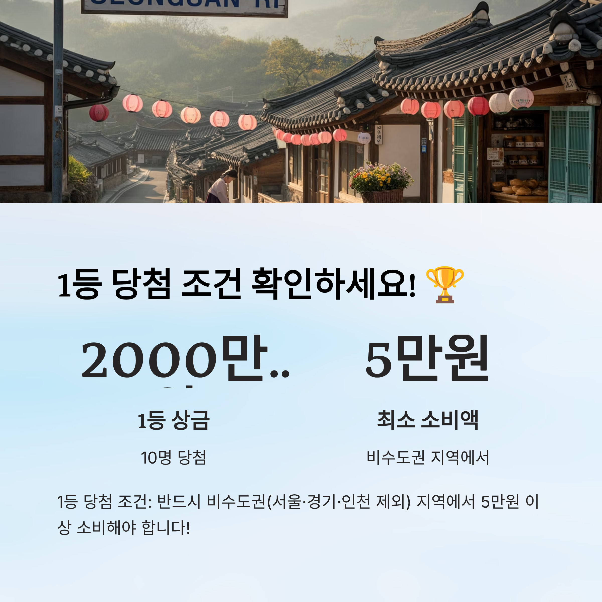 특히 1등 당첨 조건에는 지역 제한이 있어요. 수도권(서울·경기·인천)을 제외한 비수도권 지역에서 최소 5만 원 이상을 결제해야만 1등 자격이 주어져요. 예를 들어 수도권 4만 원 + 지방 1만 원 = 총 5만 원을 소비했더라도 1등 추첨 대상에는 포함되지 않아요. 🏞️