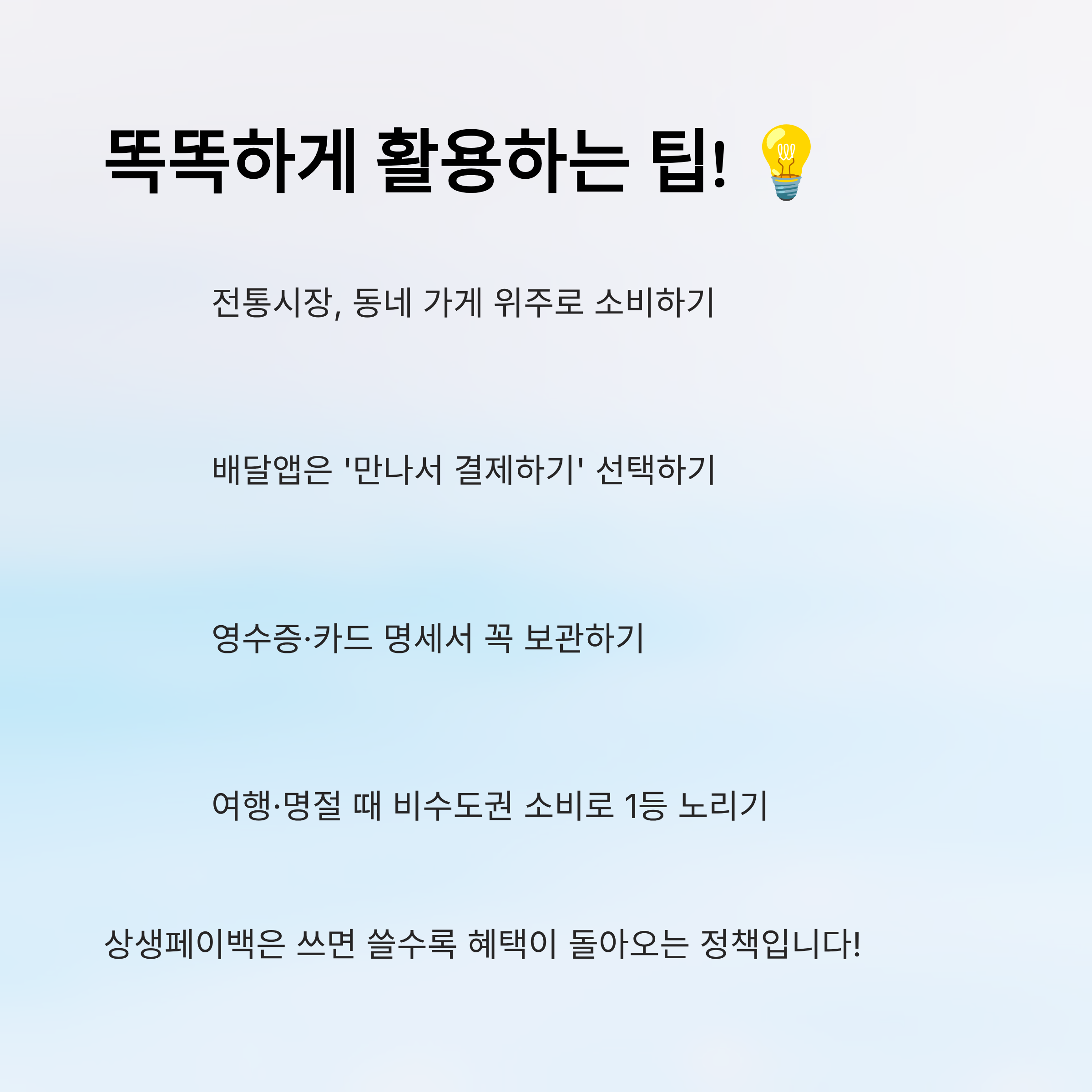실질적으로 환급을 받게 되면, 그 돈이 다시 지역 상권에서 쓰이게 돼요. 소비자는 혜택을 받아 기분 좋게 쓰고, 상인은 매출이 늘어나고, 지역경제는 활력을 얻는 순환 구조가 형성되는 거예요. 이런 점에서 상생페이백은 정책명 그대로 ‘상생’을 실현하는 제도라고 볼 수 있어요. 💡