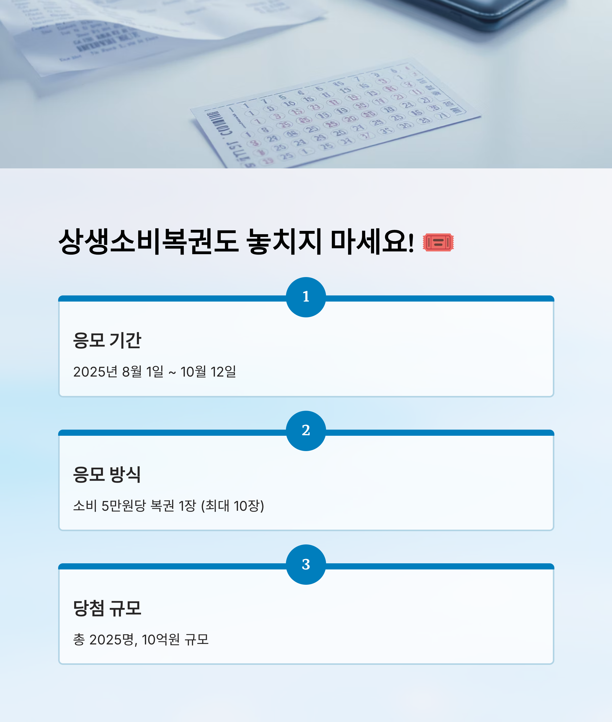 상생소비복권은 2025년 8월 1일부터 10월 12일까지 진행돼요. 이 기간 동안 소상공인 매장에서의 카드 결제 누적액 5만 원당 복권 1장이 지급되며, 최대 10장까지 받을 수 있어요. 별도의 지류 복권은 없고, 상생페이백.kr 누리집에서 온라인으로 확인 가능해요. 💻