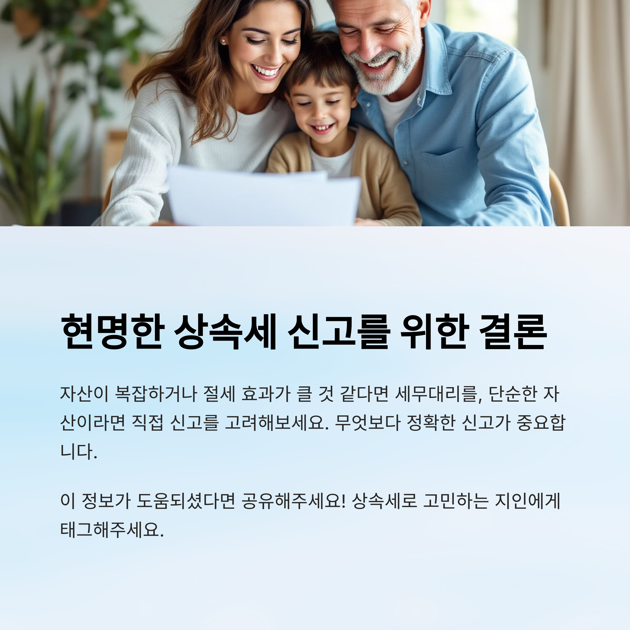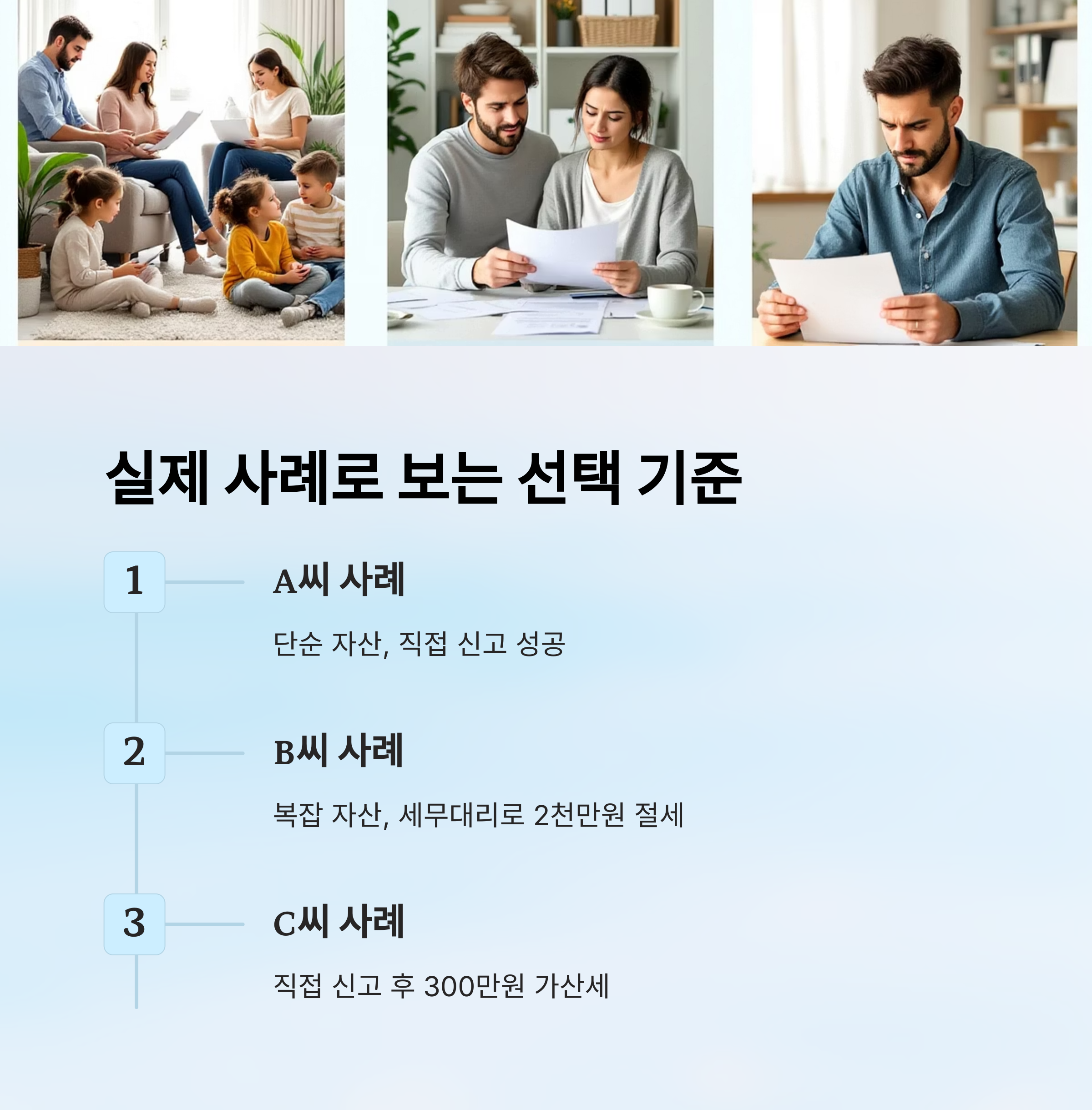 사례처럼 조건에 따라 결과는 극명하게 갈려요. 자산이 복잡하거나 가족 간 입장 차이가 있다면 전문가의 조력을 받는 게 훨씬 안정적이에요.