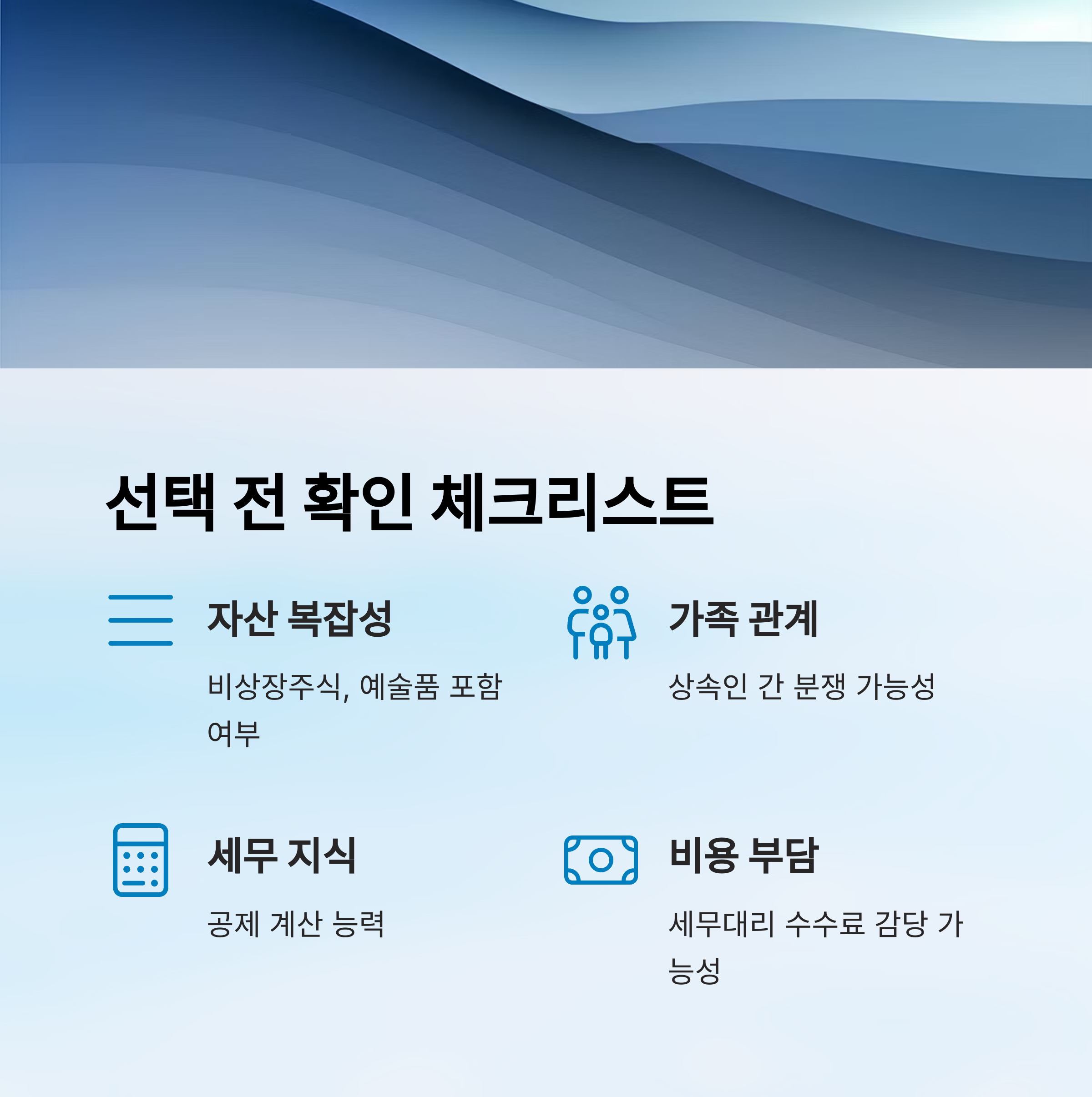 상속세 신고 방법을 결정하기 전 꼭 체크해야 할 몇 가지 항목이 있어요. 이 체크리스트만 꼼꼼히 살펴봐도 어느 쪽이 나한테 더 맞는지 알 수 있어요!