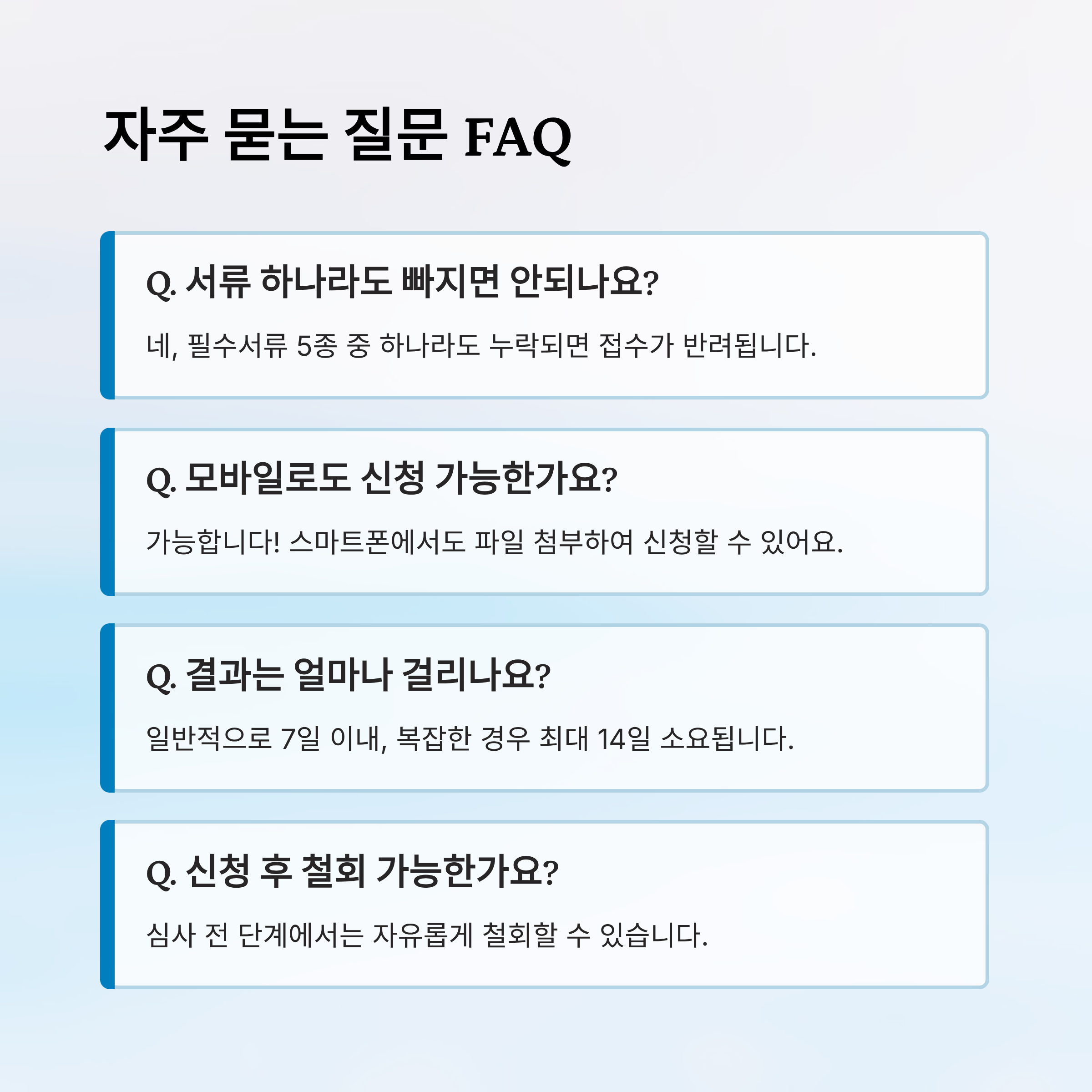 A2. 네, 필수서류 5종 중 한 가지라도 누락되면 접수가 반려돼요. 온라인은 업로드 단계에서 오류가 뜨고, 방문은 접수 자체가 불가능해요.