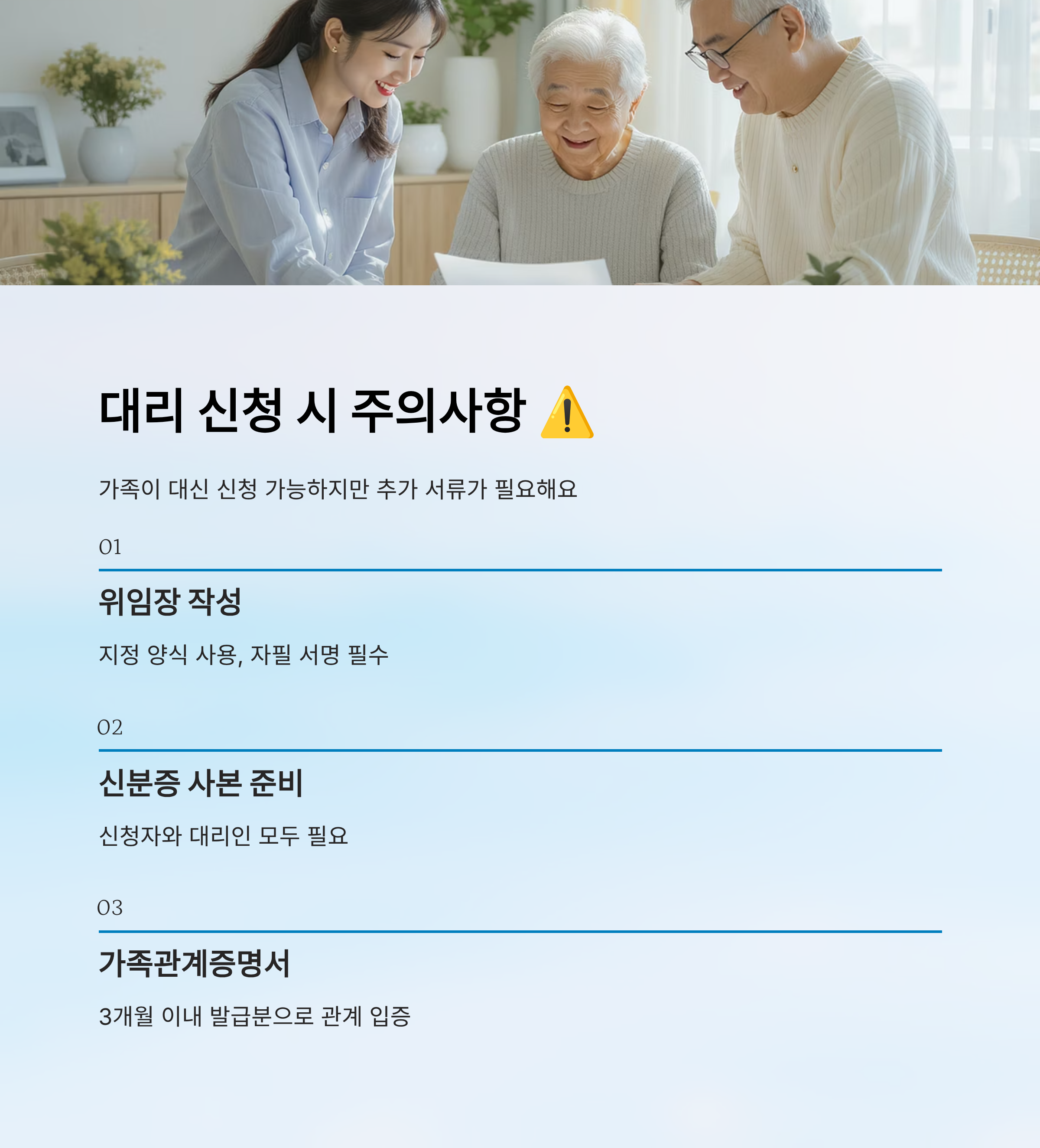 "가족이 대신 신청해줘도 되나요?"라는 질문 정말 많아요. 결론부터 말하면, 대리 신청은 가능해요. 하지만 몇 가지 조건과 주의사항이 있어요. 실수 없이 잘 처리하려면 꼭 이 섹션을 끝까지 읽어야 해요!