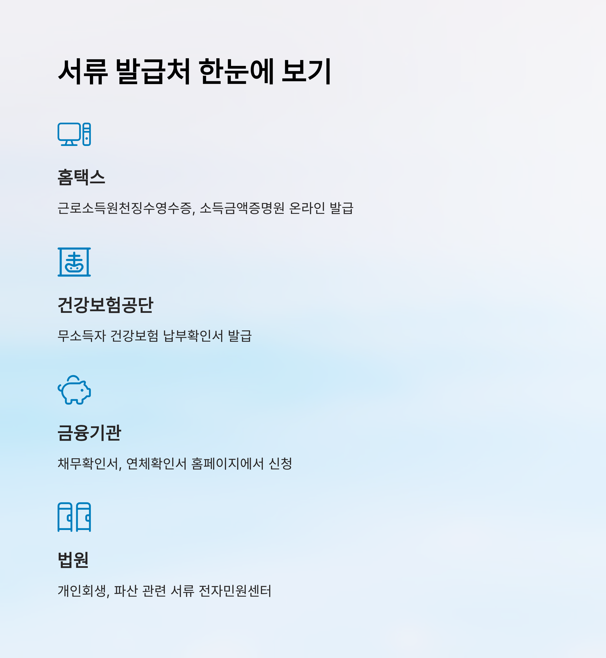 서류 5가지를 준비하려면, 어디서 어떻게 발급받는지가 핵심이에요. 대부분은 정부 공식 사이트에서 온라인으로 가능하고, 일부는 오프라인 창구 방문이 필요할 수 있어요. 아래에서 하나씩 정리해볼게요!