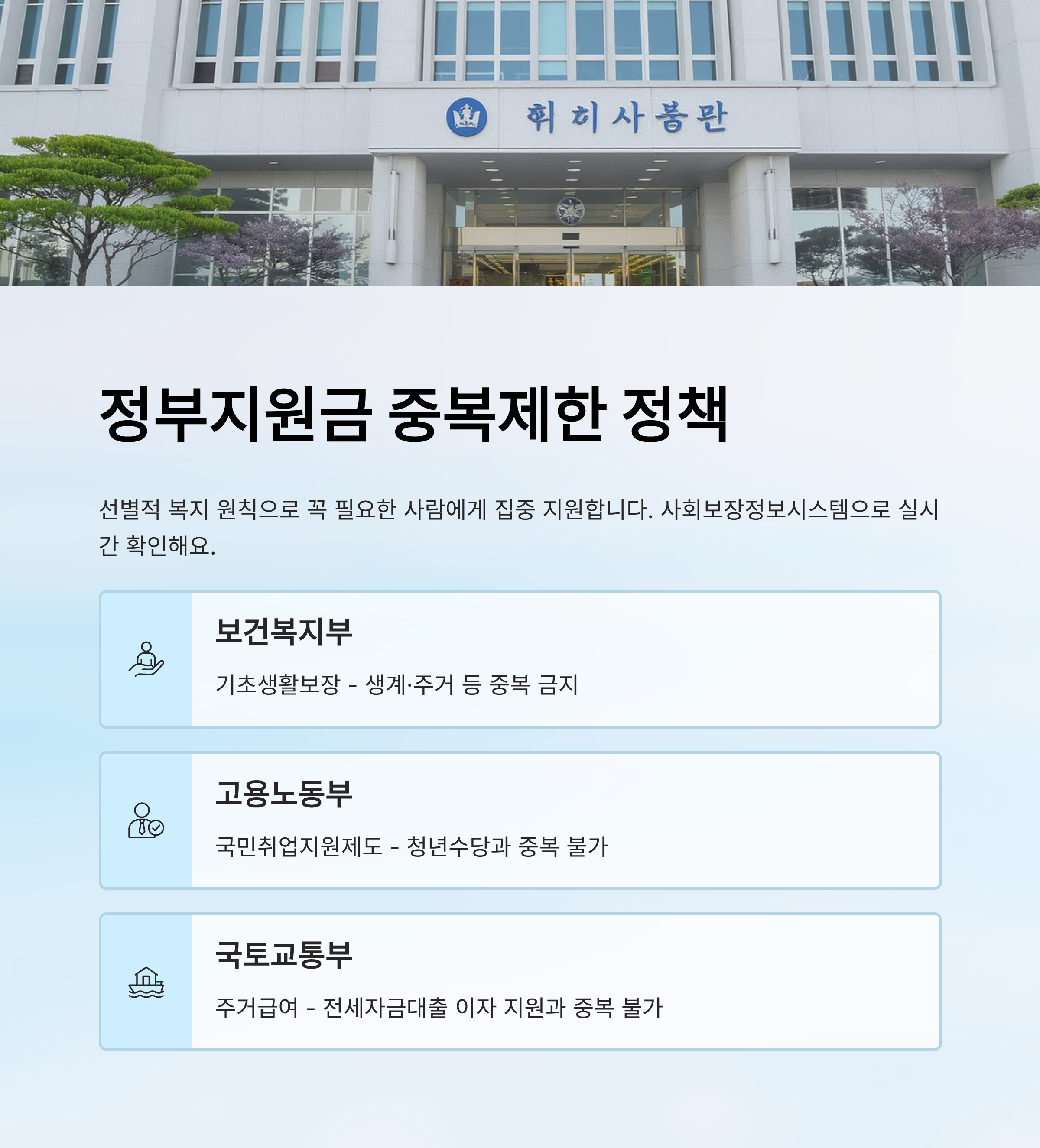우리나라 정부는 수혜자 간 형평성과 예산 효율성을 위해 다양한 **중복 제한 정책**을 운영하고 있어요. 특히 복지, 고용, 주거, 교육 등 영역별로 **같은 목적의 지원은 한 번만 받도록** 제한을 두는 경우가 많답니다. 예를 들어, 같은 시기에 생계 지원금을 두 곳에서 받는 건 원칙적으로 금지돼요.