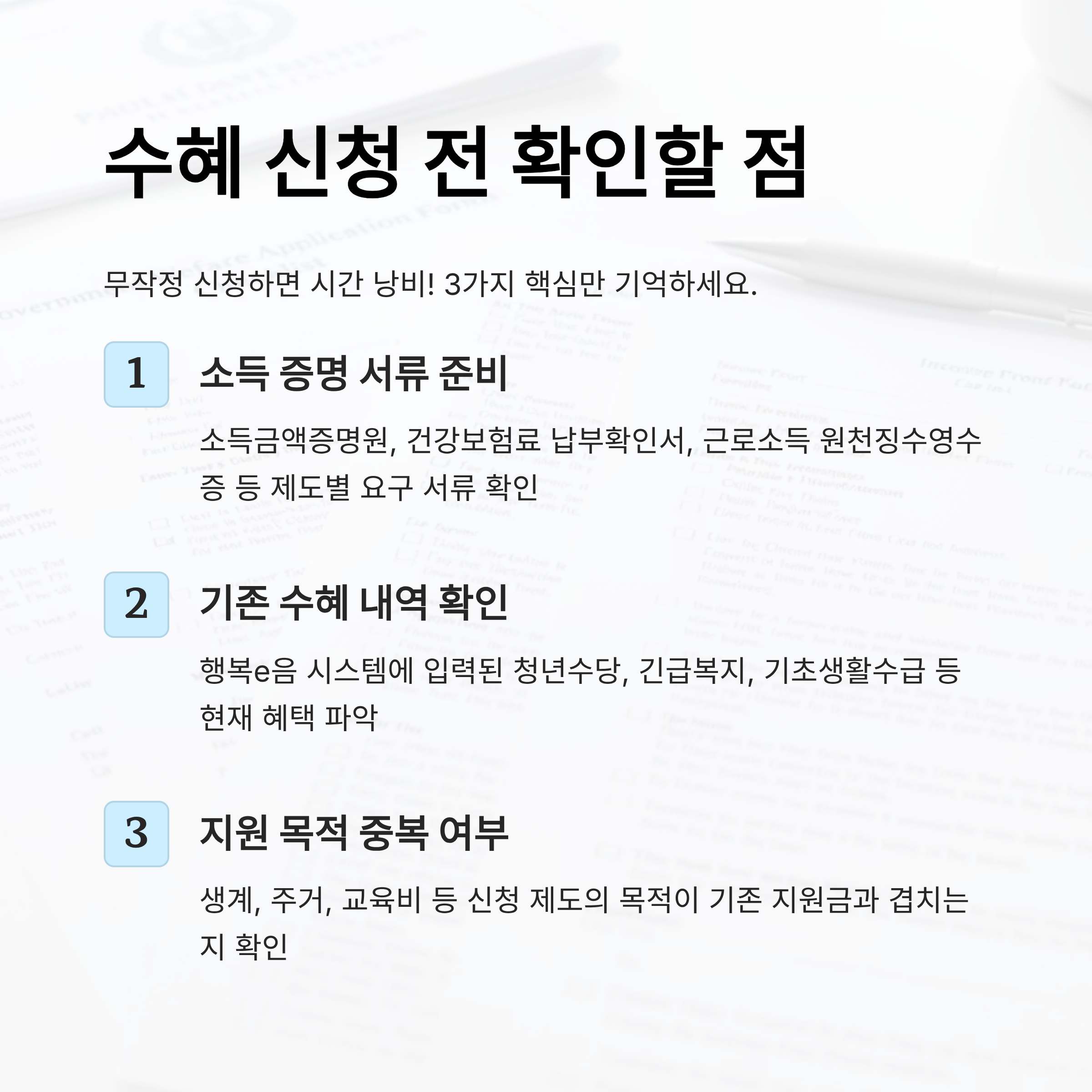 제도마다 명시된 기준이 다르기 때문에, 자신이 어떤 복지를 신청하려는지, 현재 받고 있는 다른 혜택과 목적이 겹치는지 꼭 확인해야 해요. 이렇게 꼼꼼히 따져봐야 실제 신청에서 불이익을 피할 수 있답니다 😊