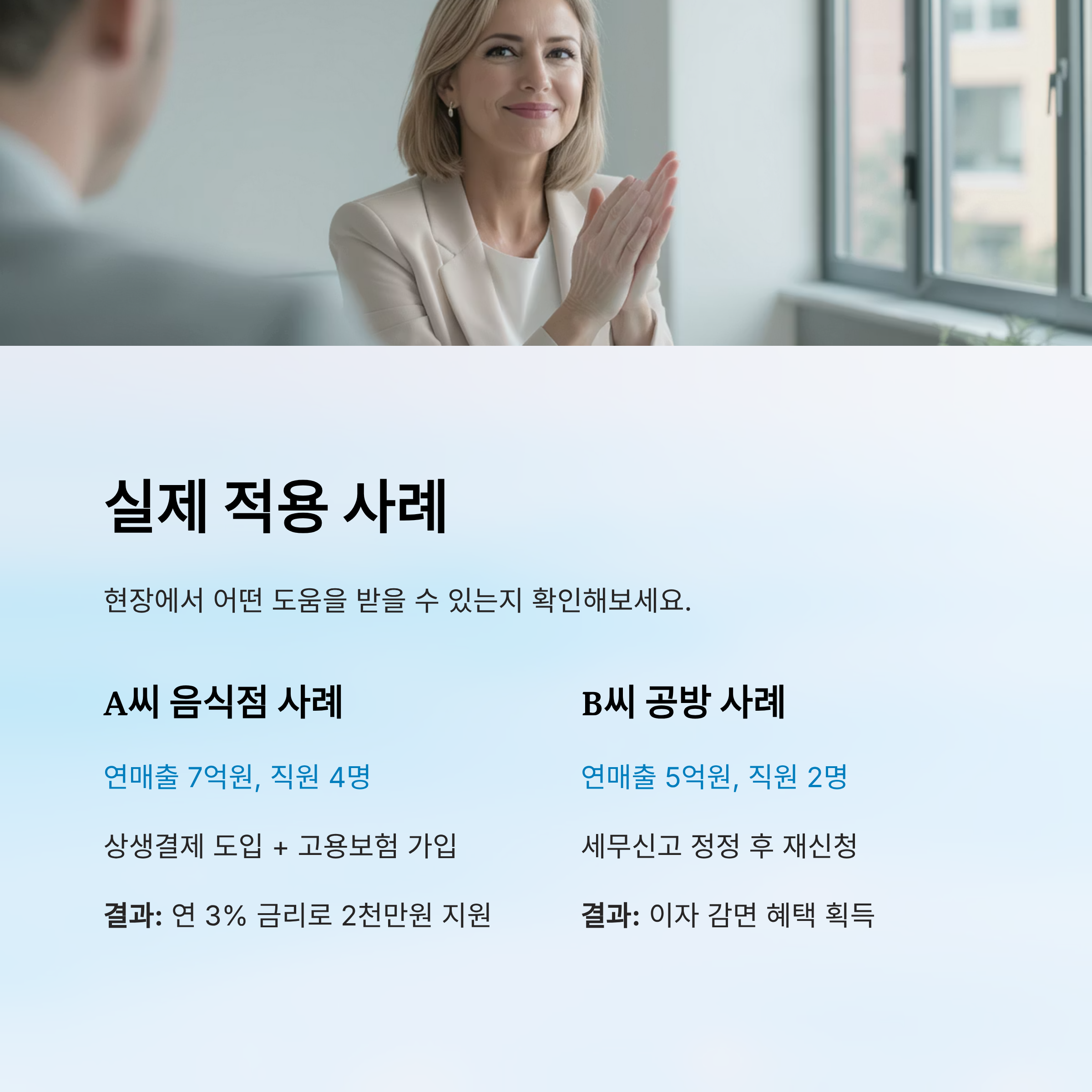 또 다른 예는 광주에서 공방을 운영하는 B씨의 경우인데요. 연매출은 5억 원, 직원은 2명으로 기준을 충족했지만, 세무 신고 누락 이력이 있어 초기 신청에서 제외됐어요. 이후 정정 신고 후 재신청해 승인을 받았고, 이자 일부를 감면받는 혜택까지 누릴 수 있었어요.