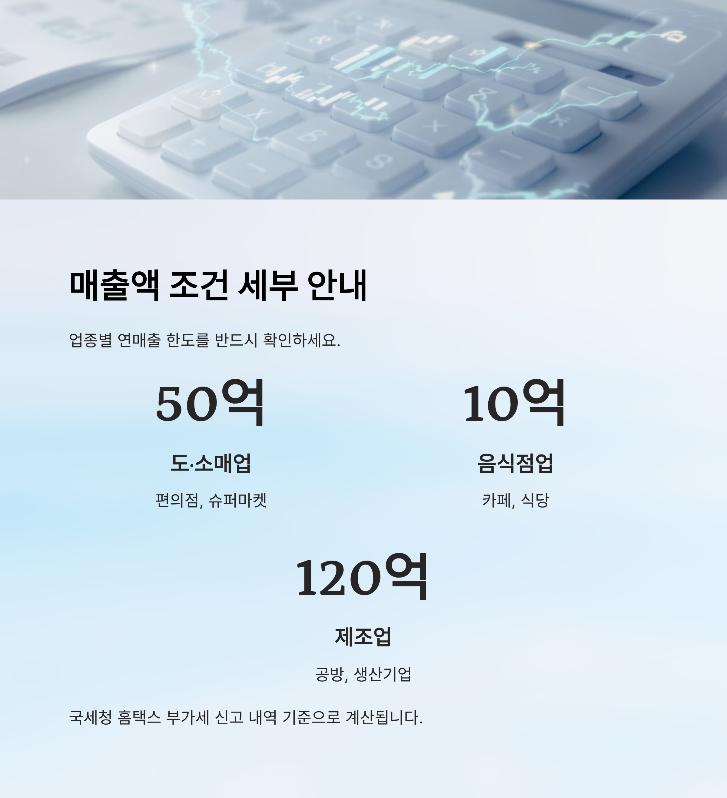 2025년을 기준으로 보면, 도·소매업은 연매출 50억 원 이하, 음식점업은 10억 원 이하, 제조업은 120억 원 이하 등 업종마다 차이가 있어요. 이 수치를 초과하면 근로자 수 요건을 충족하더라도 소상공인으로 인정되지 않아요.