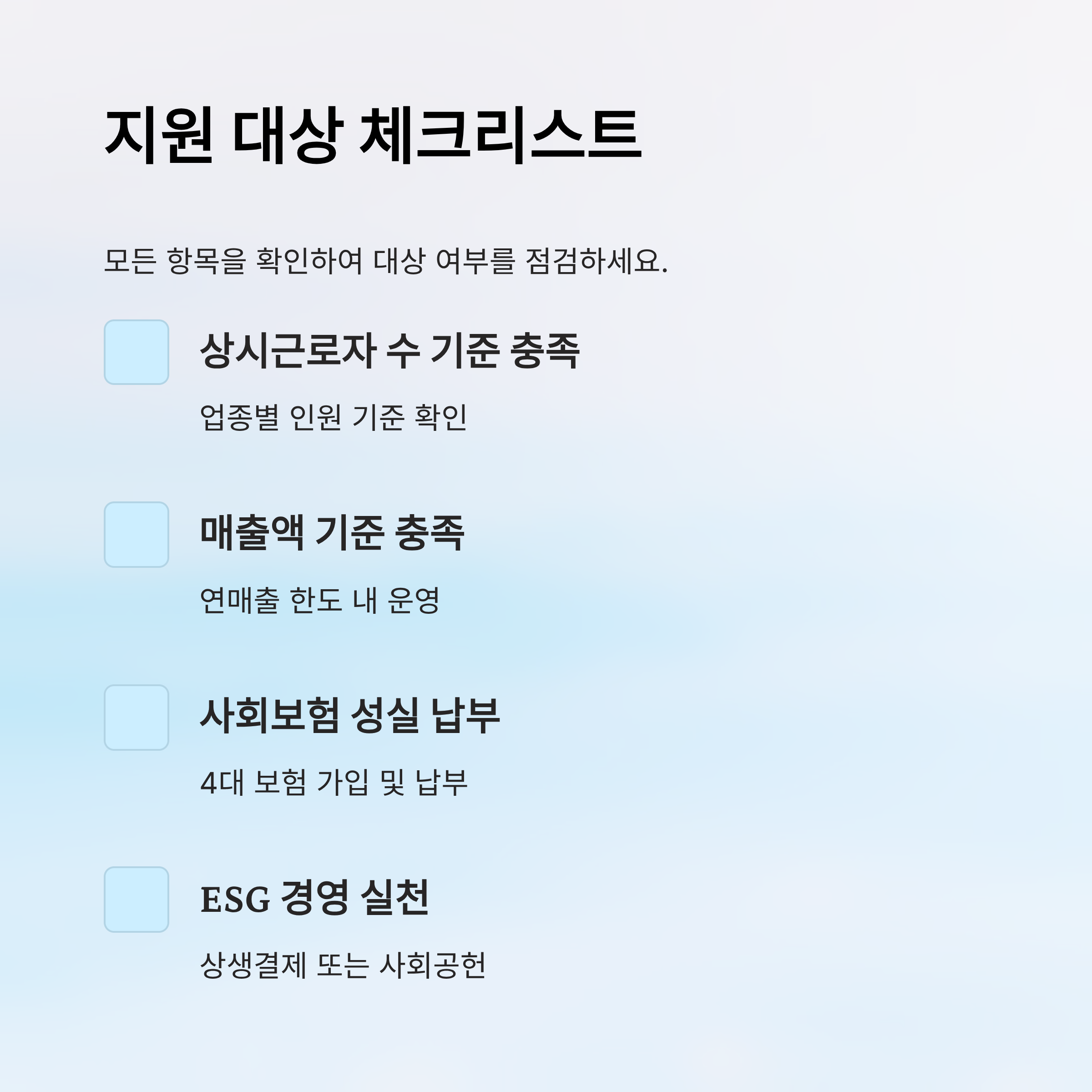 | 업종 | 근로자 수 기준 | 매출액 조건 | ESG/사회보험 | 신청 시 유리한 요소 |