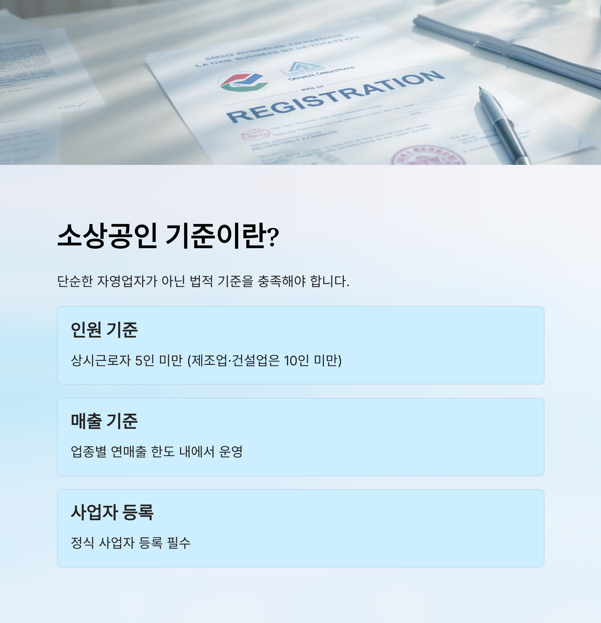 ‘소상공인’이란 단순히 작은 규모의 자영업자를 말하는 게 아니에요. 중소벤처기업부가 법으로 정한 정확한 기준이 있고, 그 기준을 충족해야만 소상공인 지원 혜택을 받을 수 있어요. 기본적으로 상시근로자 수와 매출액 기준이 모두 충족돼야 하죠.