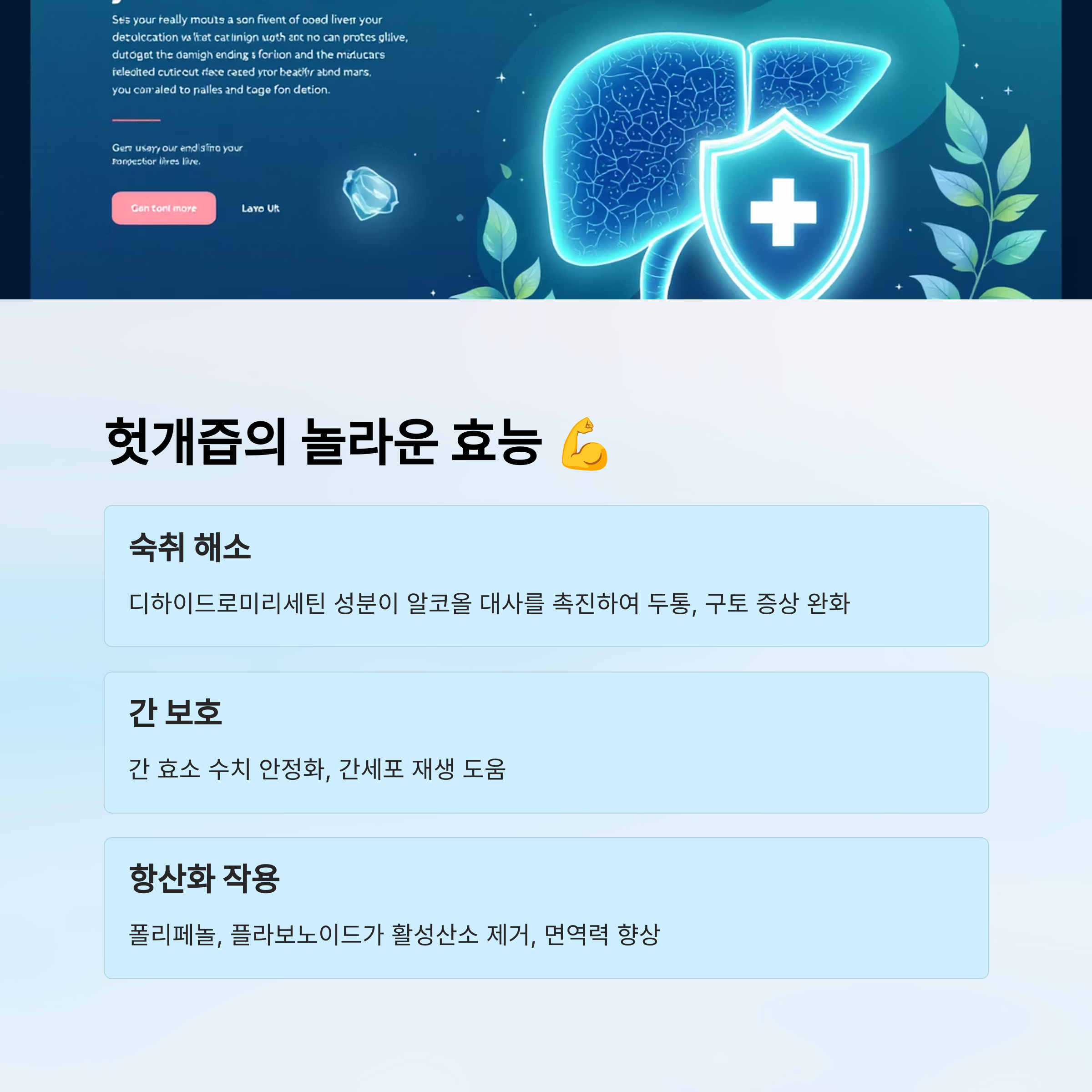 헛개즙이 가장 유명한 이유는 숙취 해소 효과예요. 알코올 대사를 빠르게 도와주는 ‘디하이드로미리세틴’이라는 성분이 들어 있어서, 술 마신 다음날 두통이나 구토 같은 증상을 완화해줘요.