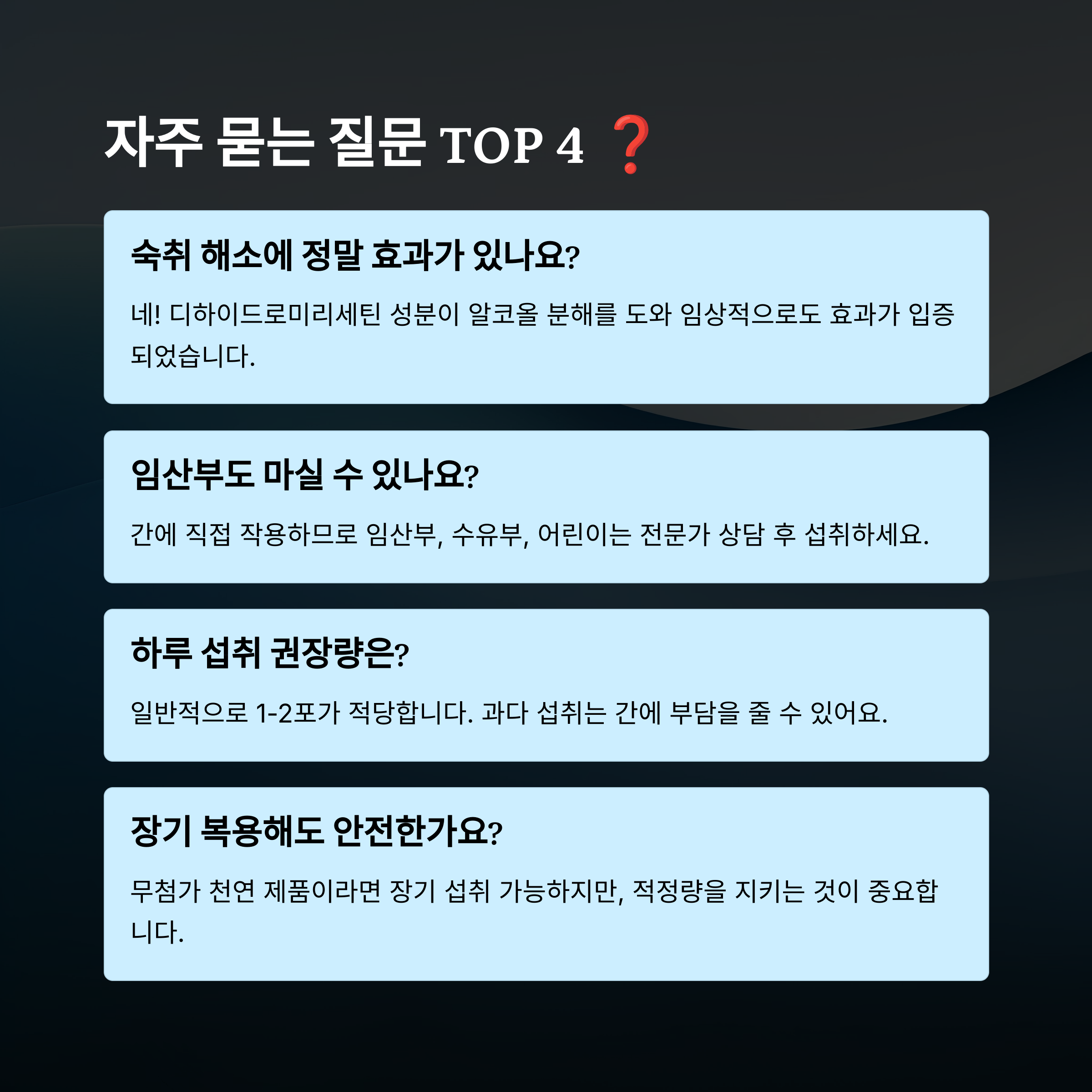 A3. 기본적으로 천연 추출물이지만, 간에 직접 작용하기 때문에 어린이, 임산부, 수유부는 전문가 상담 후 섭취하는 게 좋아요.
