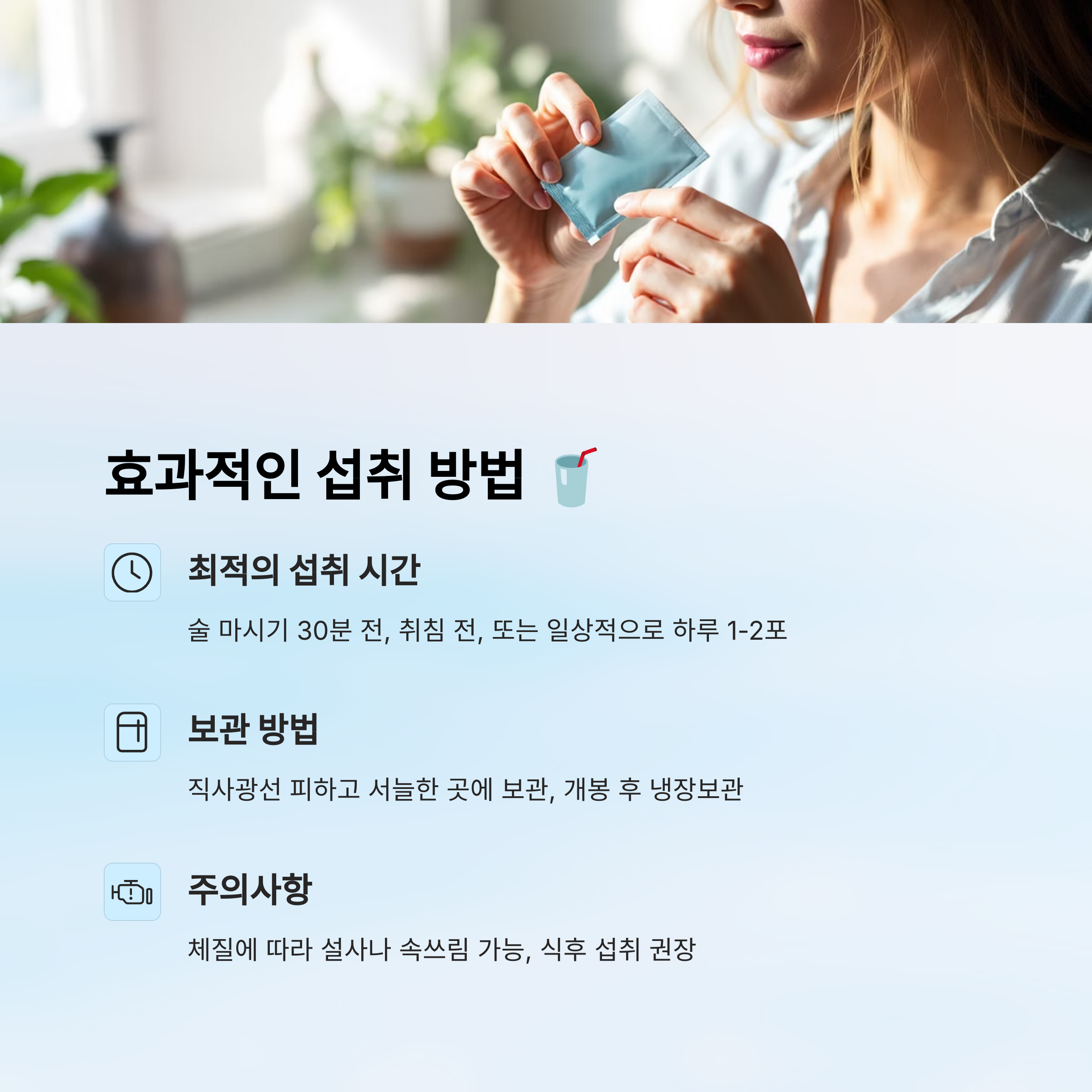 A2. 술 마시기 30분 전, 술자리 중간, 또는 취침 전 한 팩 마시면 숙취에 가장 효과적이에요. 공복보단 식후가 더 좋기도 해요.