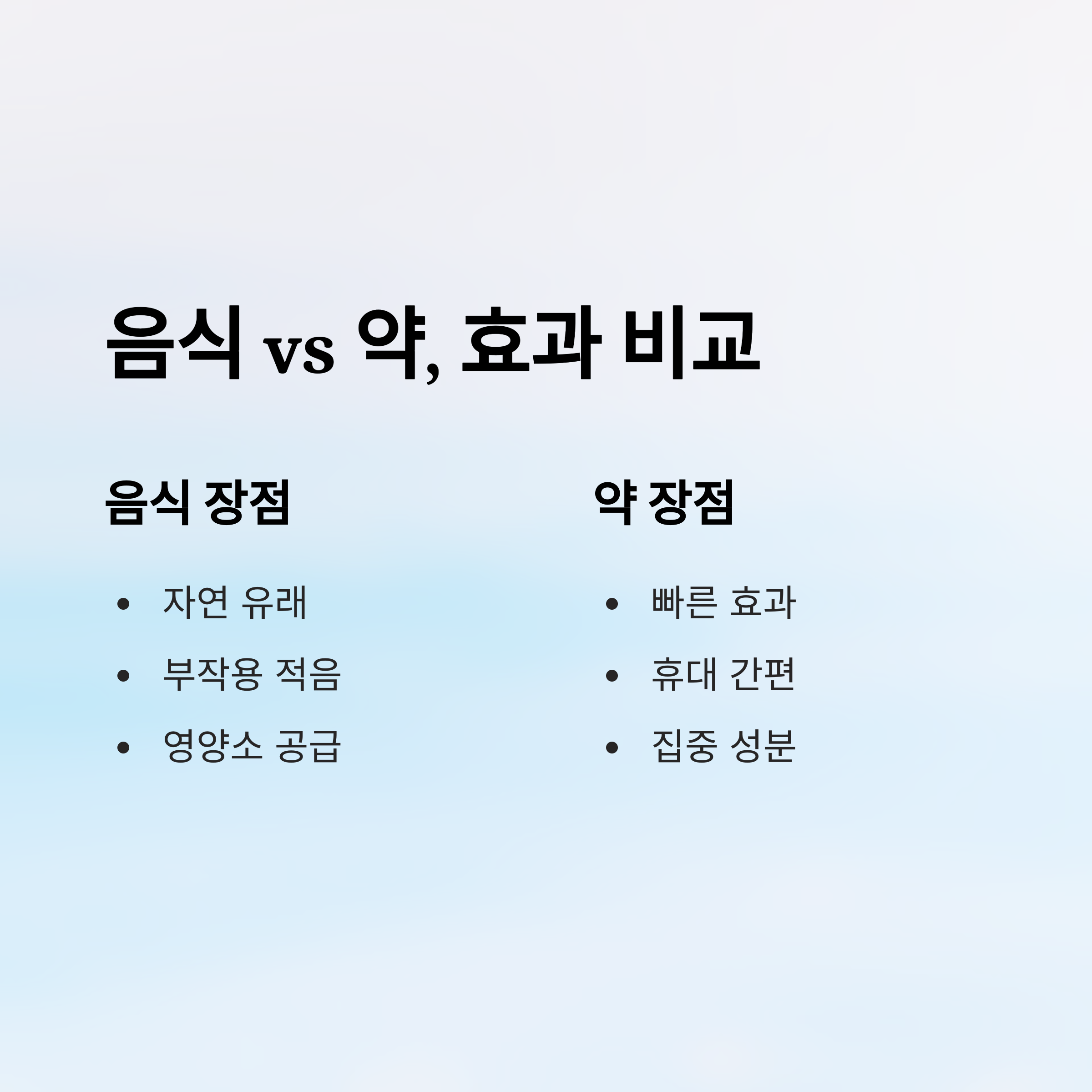 A1. 약은 빠른 효과를 주고, 음식은 자연스러운 회복을 도와줘요. 급할 땐 약, 평소에는 음식이 좋아요!