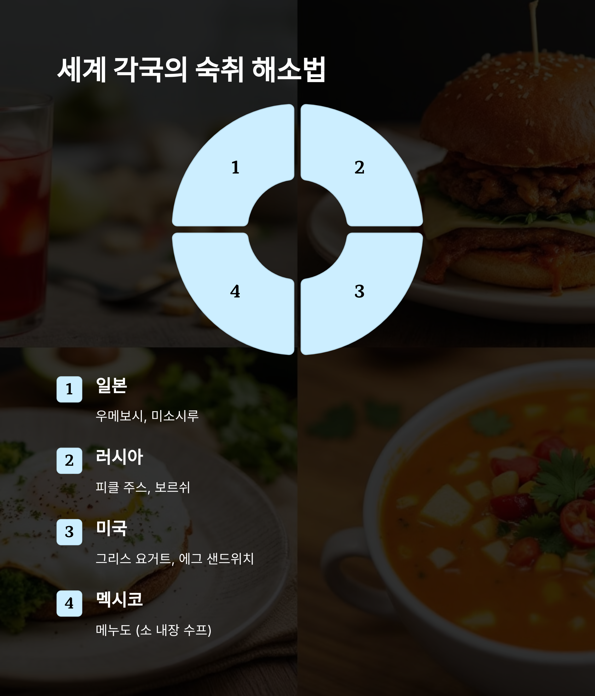 | 국가 | 해장 음식 | 특징 | 숙취 효과 |