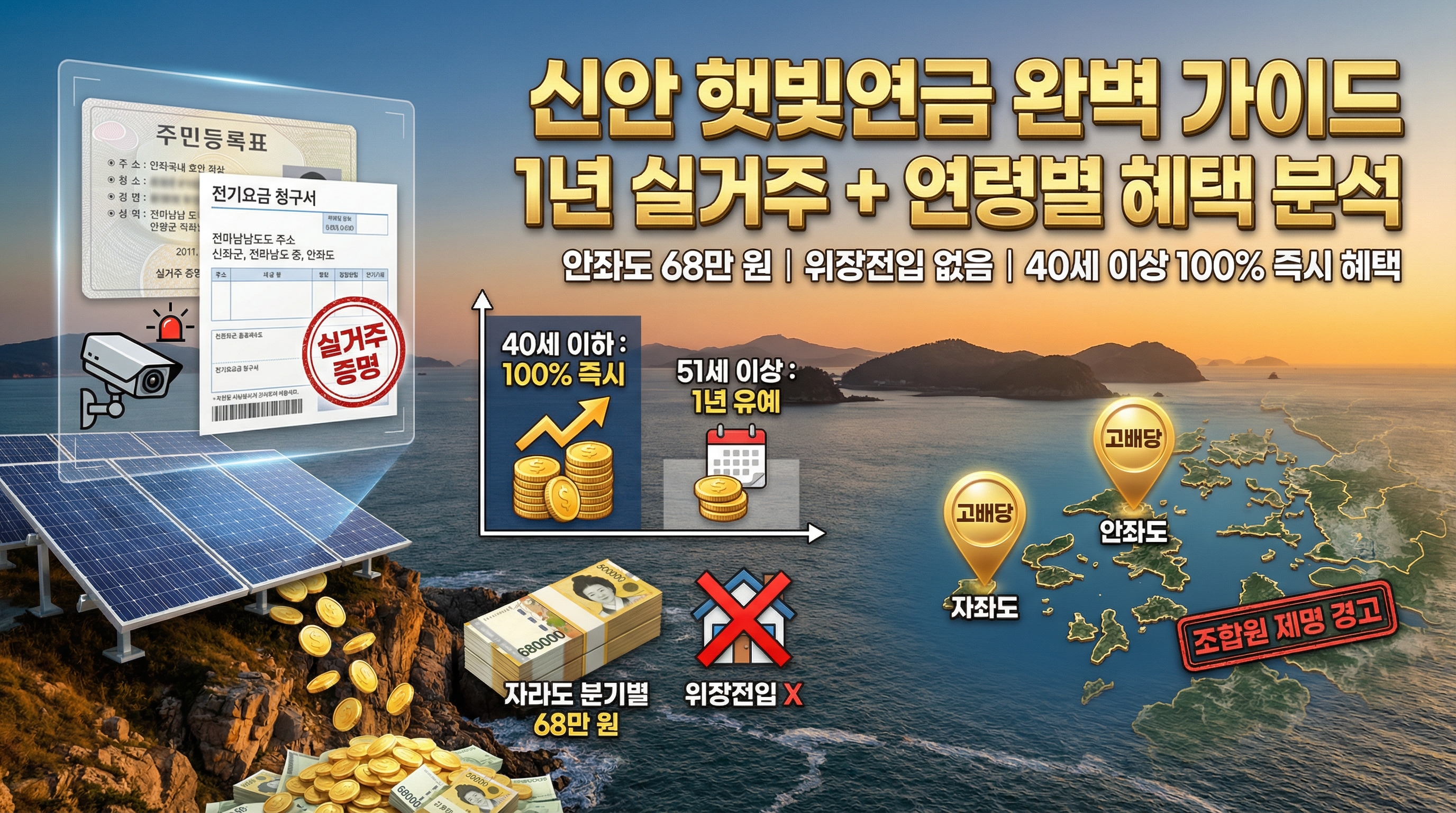 요즘 '섬마을의 기적'이라 불리는 신안군 햇빛연금 소식에 귀가 솔깃하신 분들 정말 많으시죠? 저도 처음에 이 소식을 접했을 때, "진짜 숨만 쉬어도 돈이 들어온다고?" 하며 의구심을 가졌던 기억이 납니다. 하지만 실제로 신안군 안좌도나 자라도 주민분들이 분기별로 수십만 원에서 백만 원 넘는 연금을 받는 모습을 보니 이건 단순한 소문이 아니더라고요. 하지만 세상에 공짜는 없다는 말처럼, 외지인 전입 시에는 정말 꼼꼼히 따져봐야 할 '현실적인 제약'들이 많습니다. 단순히 주소지만 옮겨두면 되겠지 했다가는 큰코다칠 수 있거든요. 오늘 제가 그 속사정을 낱낱이 파헤쳐 드릴게요! ✨