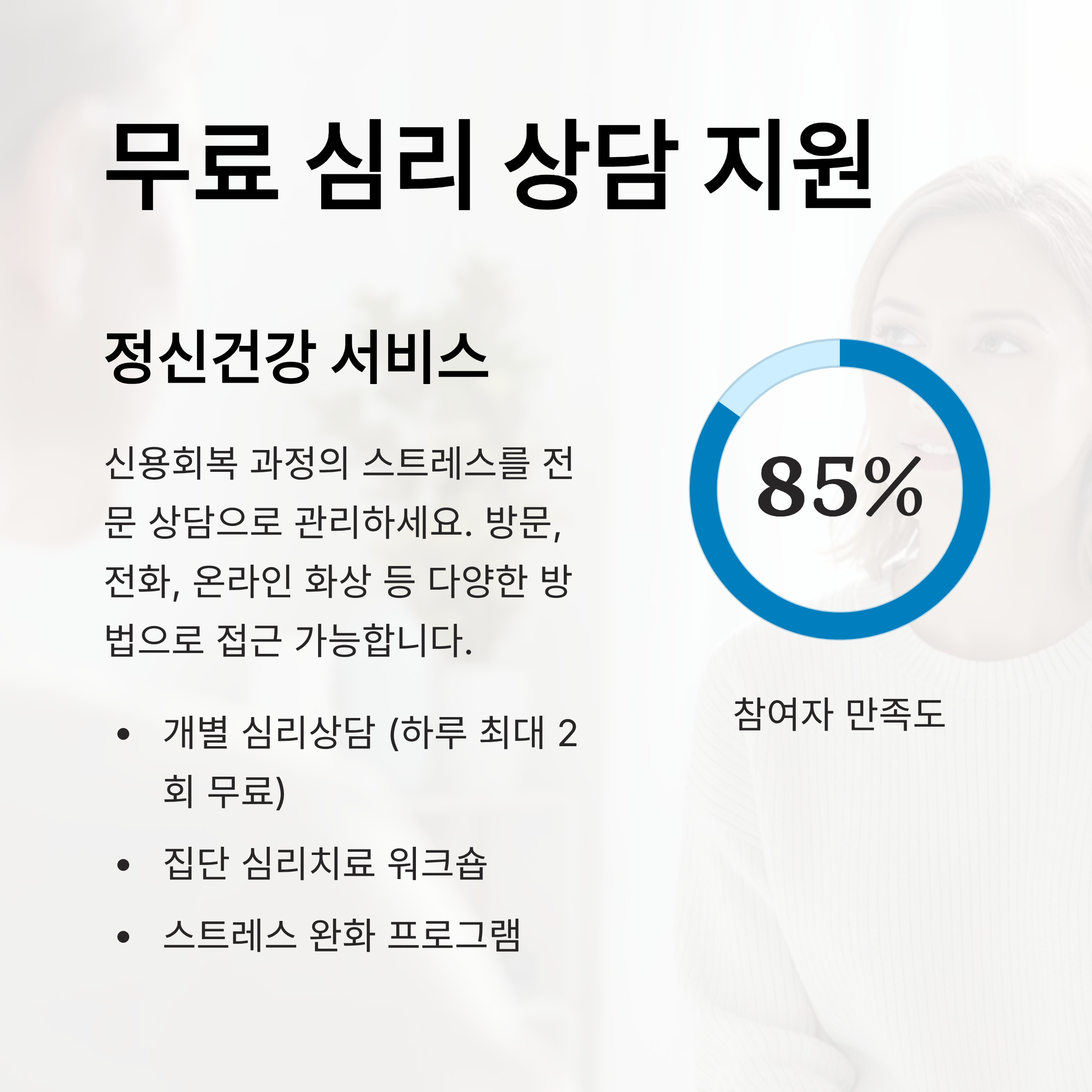 또한 일부 지방자치단체에서는 신용회복 완료자를 대상으로 집단 심리치료, 정신건강 워크숍, 스트레스 완화 프로그램 등을 운영하고 있어요. 참여자 만족도 조사에 따르면 85% 이상이 심리적 안정을 경험했다고 해요.
