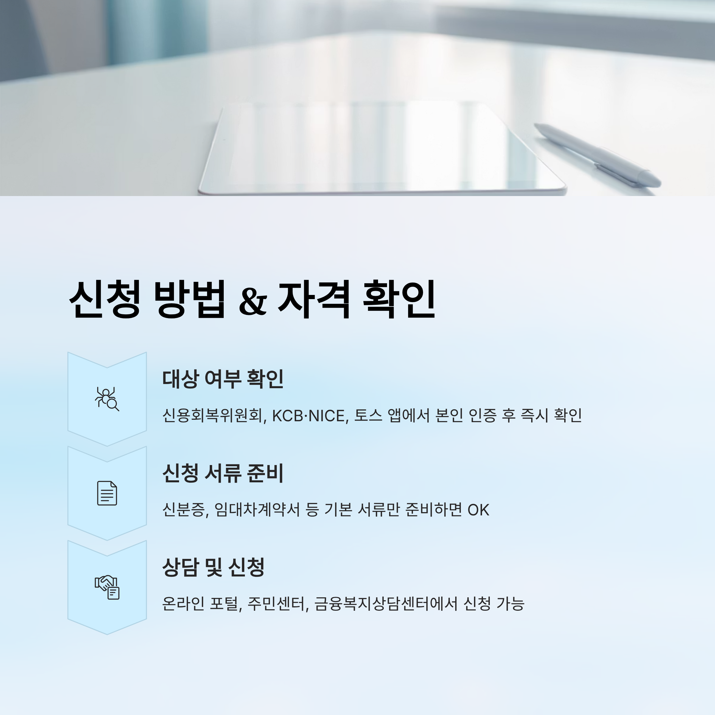 대상자 여부는 KCB·NICE 신용평가 기준으로 자동 확인되며, 신청은 온라인 포털 또는 주민센터에서 가능해요. 제출 서류도 기본 신분증과 임대차계약서만 있으면 되어서 접근성이 좋아요.