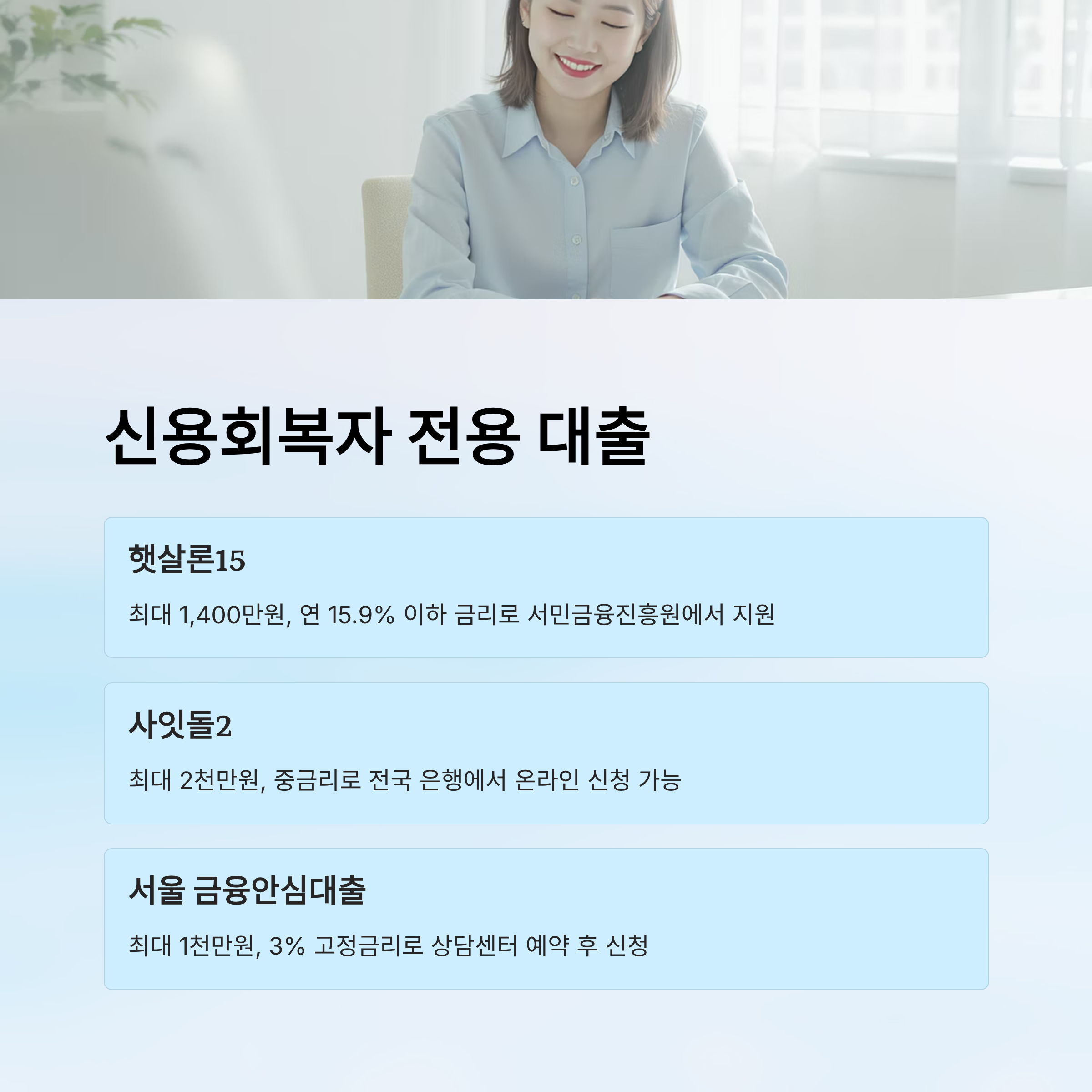 신용회복자라고 해서 모든 금융 문이 닫힌 건 아니에요. 오히려 일정 요건을 충족한 사람에게는 ‘전용 대출상품’이 열리기도 해요. 2025년 현재, 서민금융진흥원은 신용회복을 완료한 이들에게 저금리 대출을 제공하는 프로그램을 운영 중이에요. 특히 ‘햇살론15’, ‘사잇돌2’ 같은 상품은 신용회복자 전용 조건으로 제공되는 경우가 있어요.