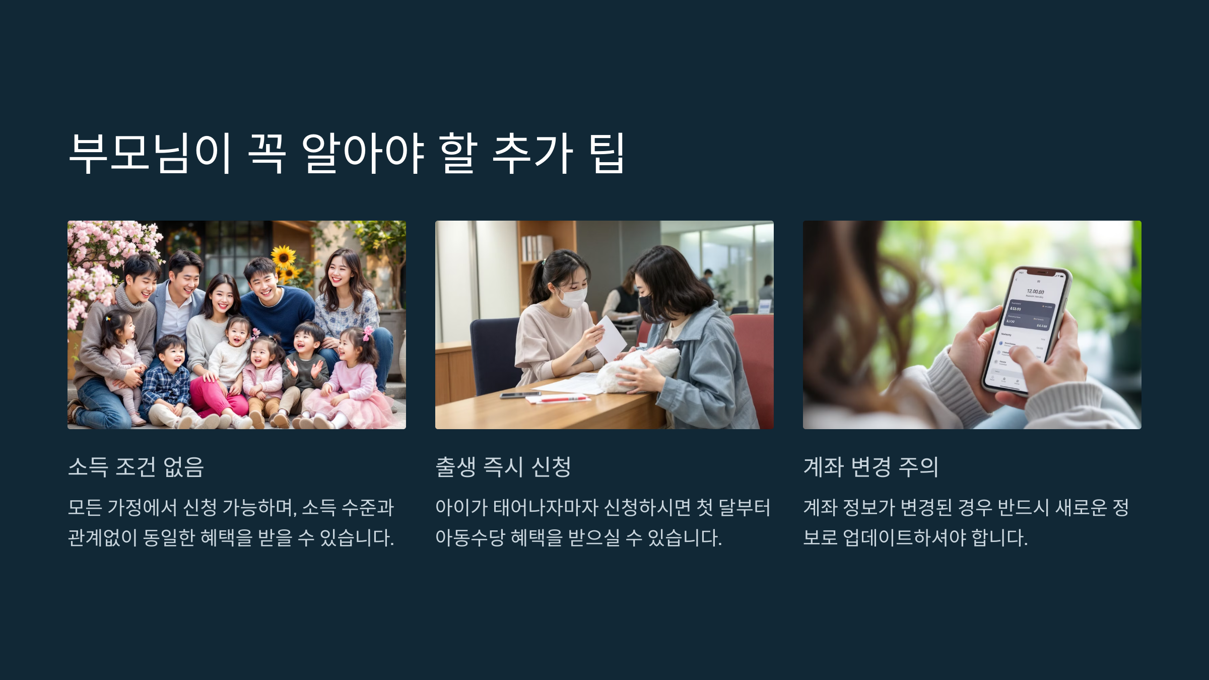 아동수당은 소득·재산 조건과 관계없이 지급되므로, 모든 가정에서 신청 가능합니다.