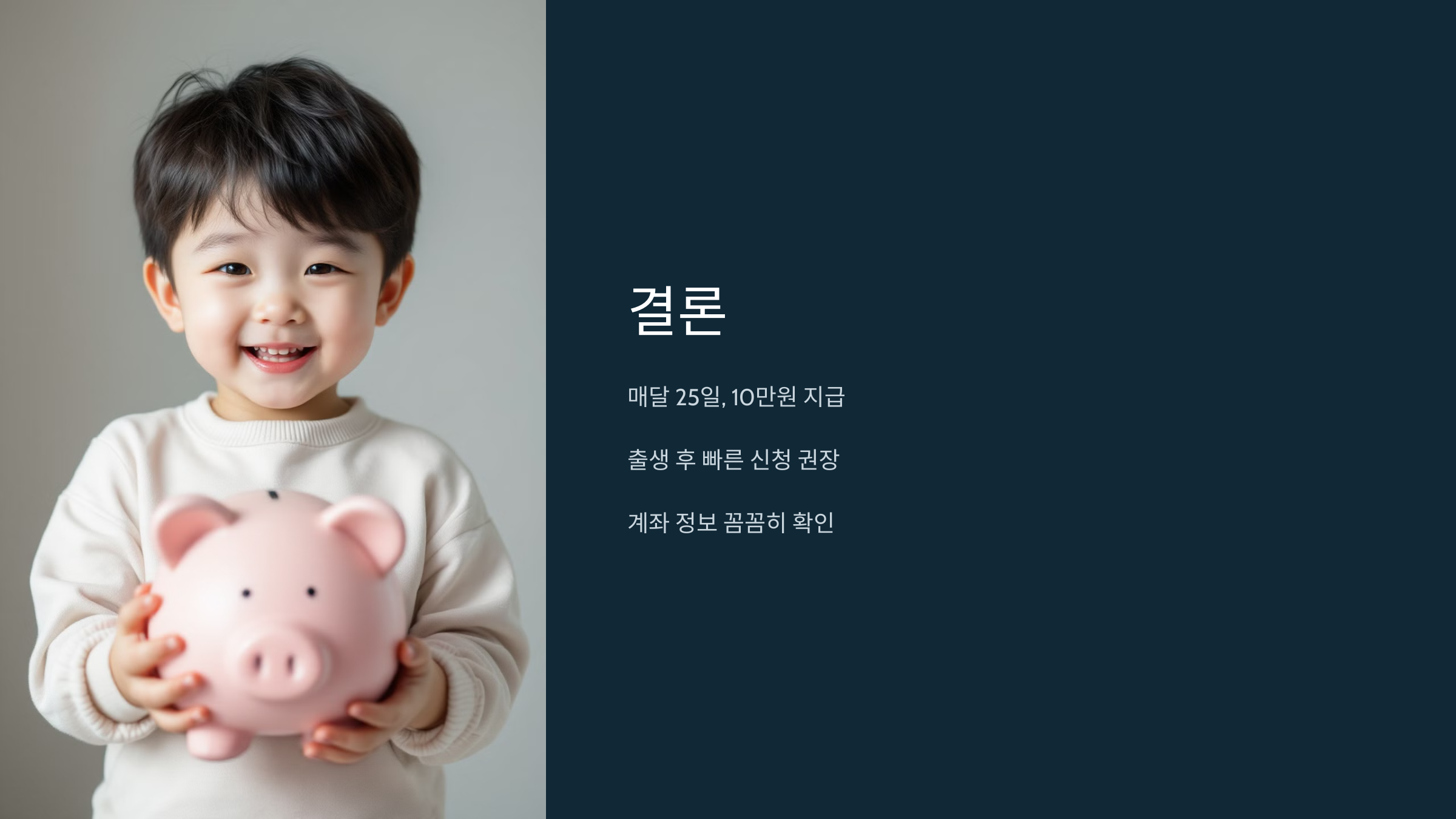 출생 후 빠르게 신청하면 매달 10만 원의 지원을 받을 수 있으니, 지급일과 계좌 정보를 꼼꼼히 확인하세요! 😊