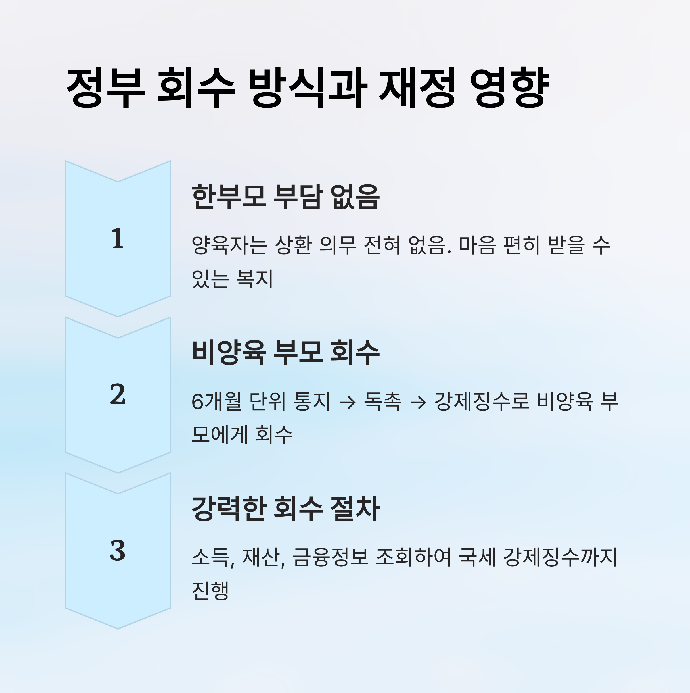 이처럼 정부의 회수 방식은 매우 강력하면서도, 양육자 입장에서 부담이 없도록 설계되어 있어요. 누구의 책임인지 명확히 구분된다는 점이 이 제도의 핵심이에요.