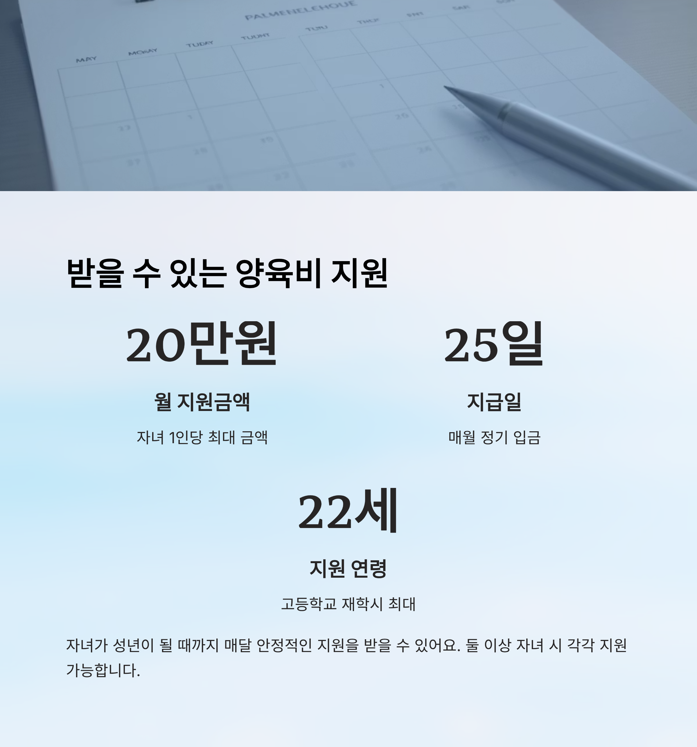 | 지원기간 | 미성년 자녀가 성년이 될 때까지 |