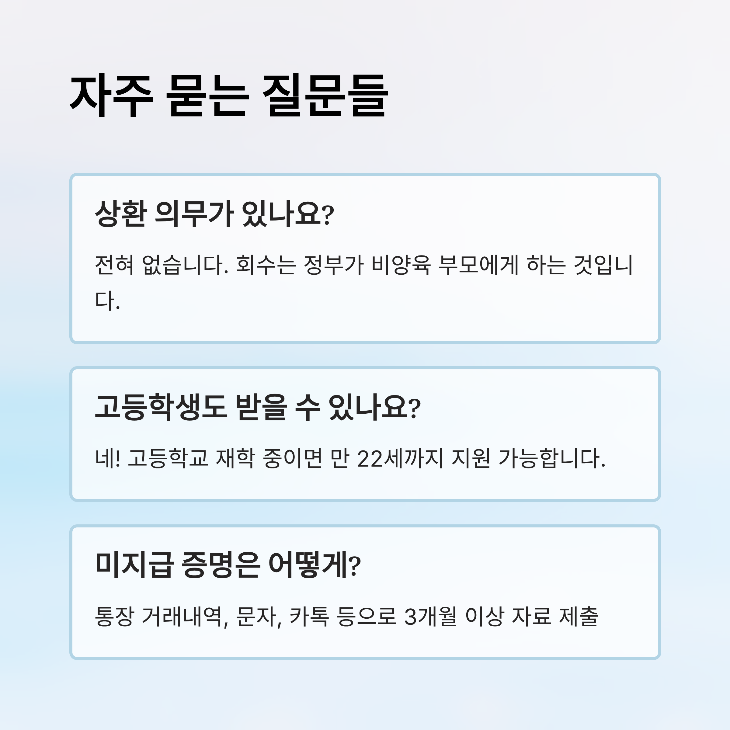 A4. 절대 아니에요! 회수는 정부가 비양육 부모에게 하는 것이고, 한부모는 상환할 필요 없어요. 안심하고 신청해도 돼요.