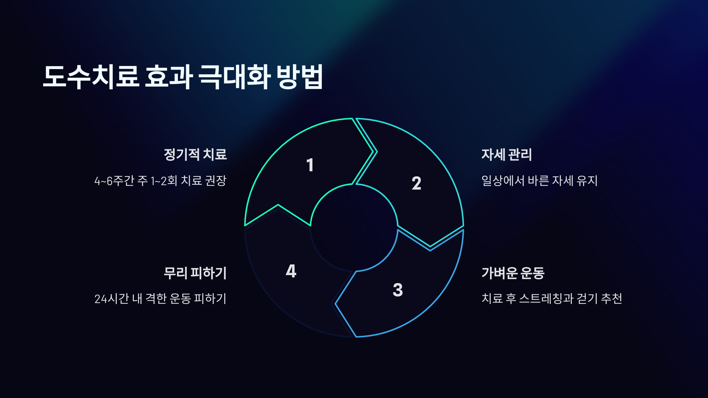 A7. 도수치료 후에는 **강도 높은 운동을 피하는 것이 좋아요.** ✔ 가벼운 스트레칭과 걷기 운동 추천 ✔ 24시간 내 격한 운동 피하기 ✔ 바른 자세 유지 & 꾸준한 관리 필요