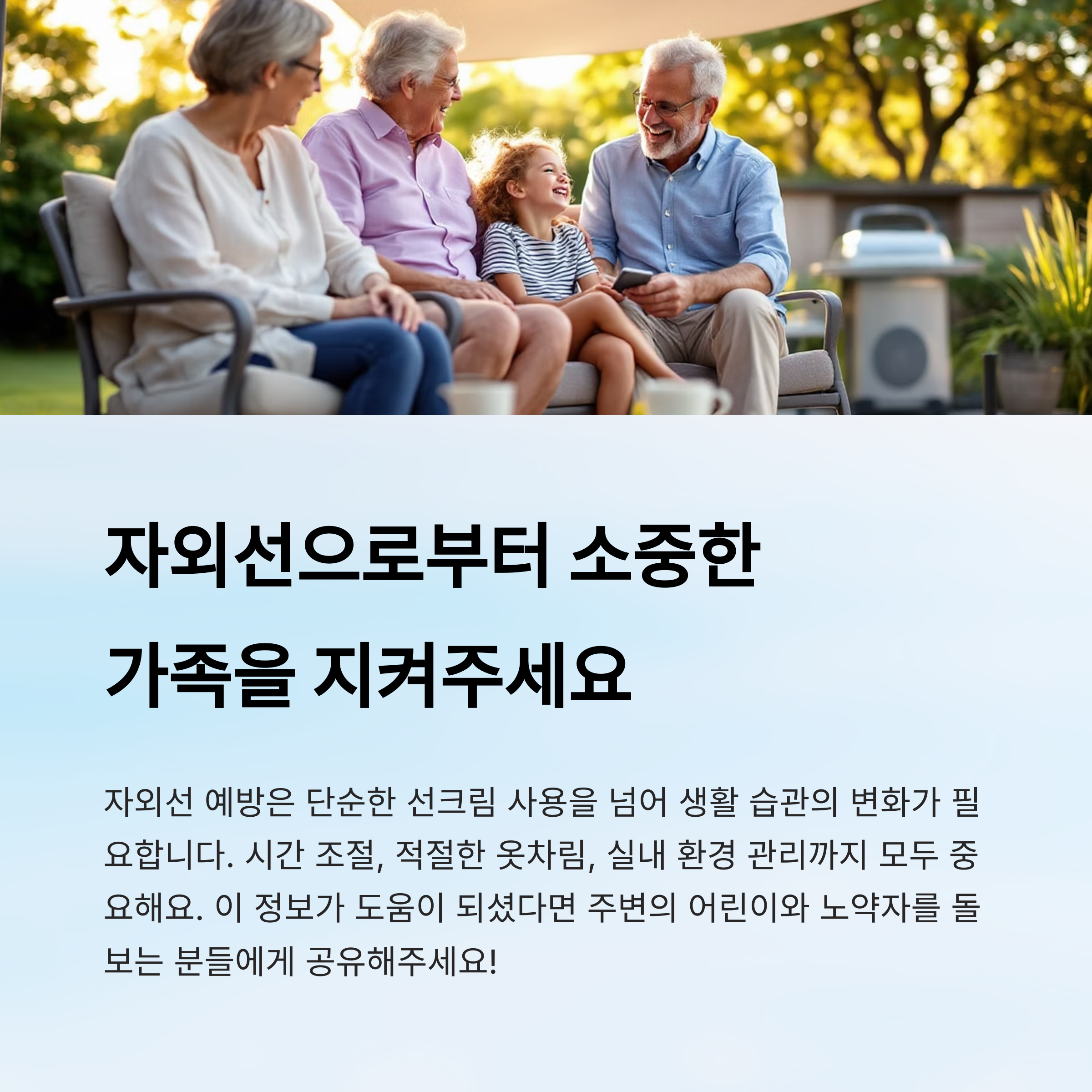 이처럼 어린이와 노약자는 자외선에 특히 민감하기 때문에 평소보다 더욱 꼼꼼한 보호가 필요해요. 외출 전에 선크림만 바르는 것에 그치지 말고, 시간, 복장, 생활 습관까지 모두 조율해야 진짜 예방이 된답니다!