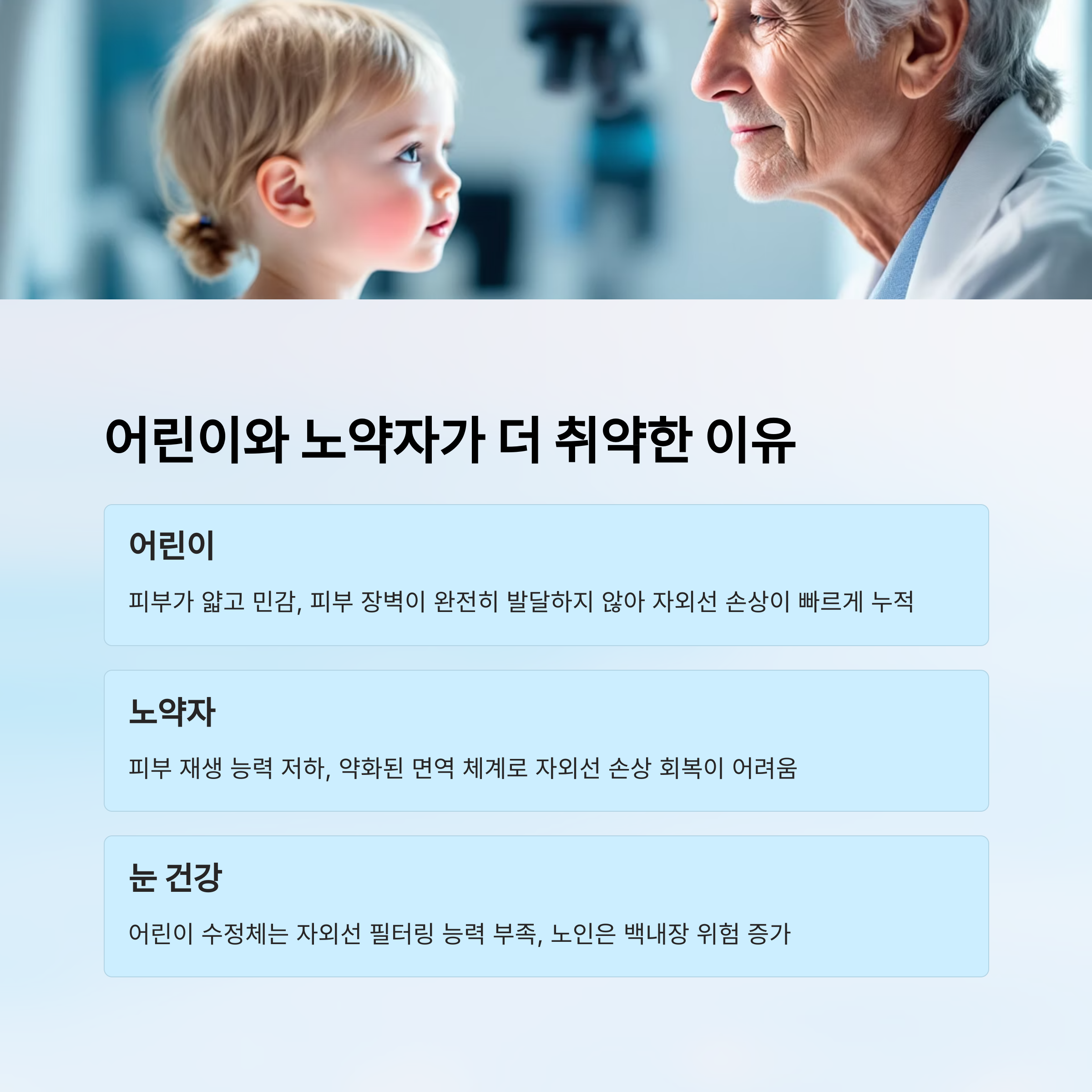 눈 건강도 문제예요. 어린이의 수정체는 자외선 필터링 능력이 떨어져 눈에 자극이 더 잘 들어오고, 노인은 백내장이나 황반변성 같은 질환에 쉽게 노출될 수 있어요. 그러니 눈 보호도 꼭 병행해야 해요!