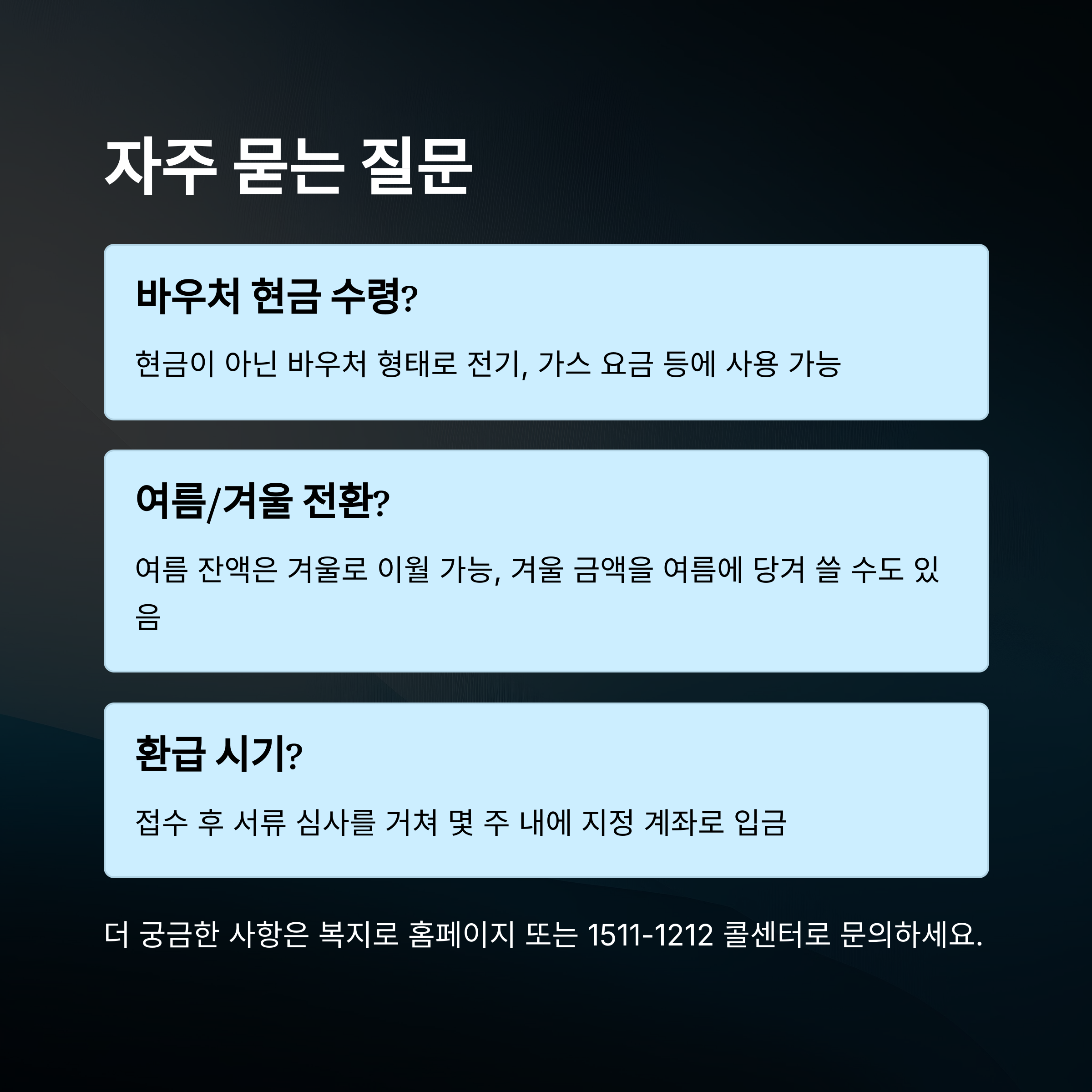 에너지 바우처 역시 매년 정해진 기한 내에 사용하지 않으면 잔액이 사라지므로, 혜택을 받고도 놓치는 일이 없도록 꼼꼼히 챙겨야 해요. 사용 마감일은 매년 12월 31일이에요.