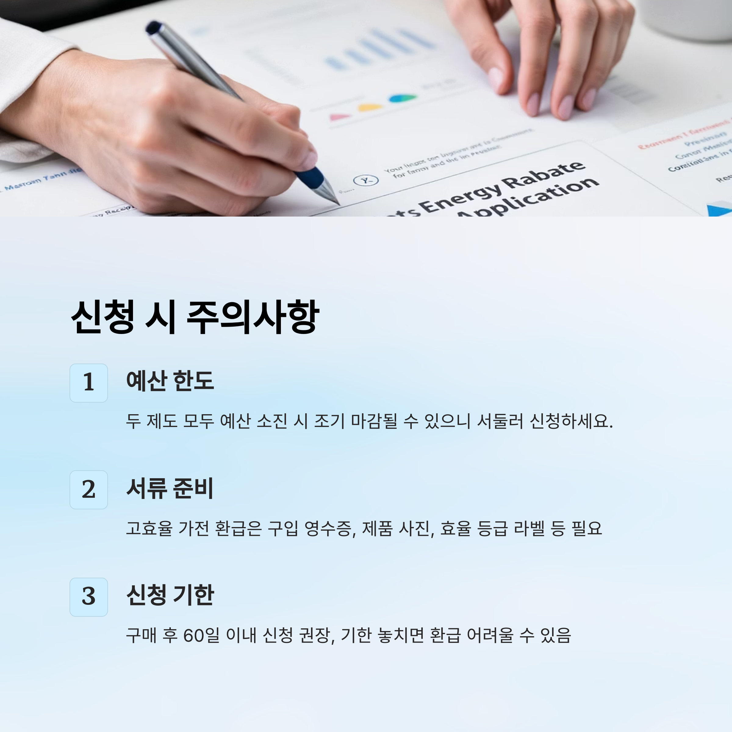 3. 고효율 가전 환급은 구입 영수증, 제품 명판 사진, 에너지 효율 등급 라벨 등 세부 서류를 꼼꼼히 준비해야 해요.