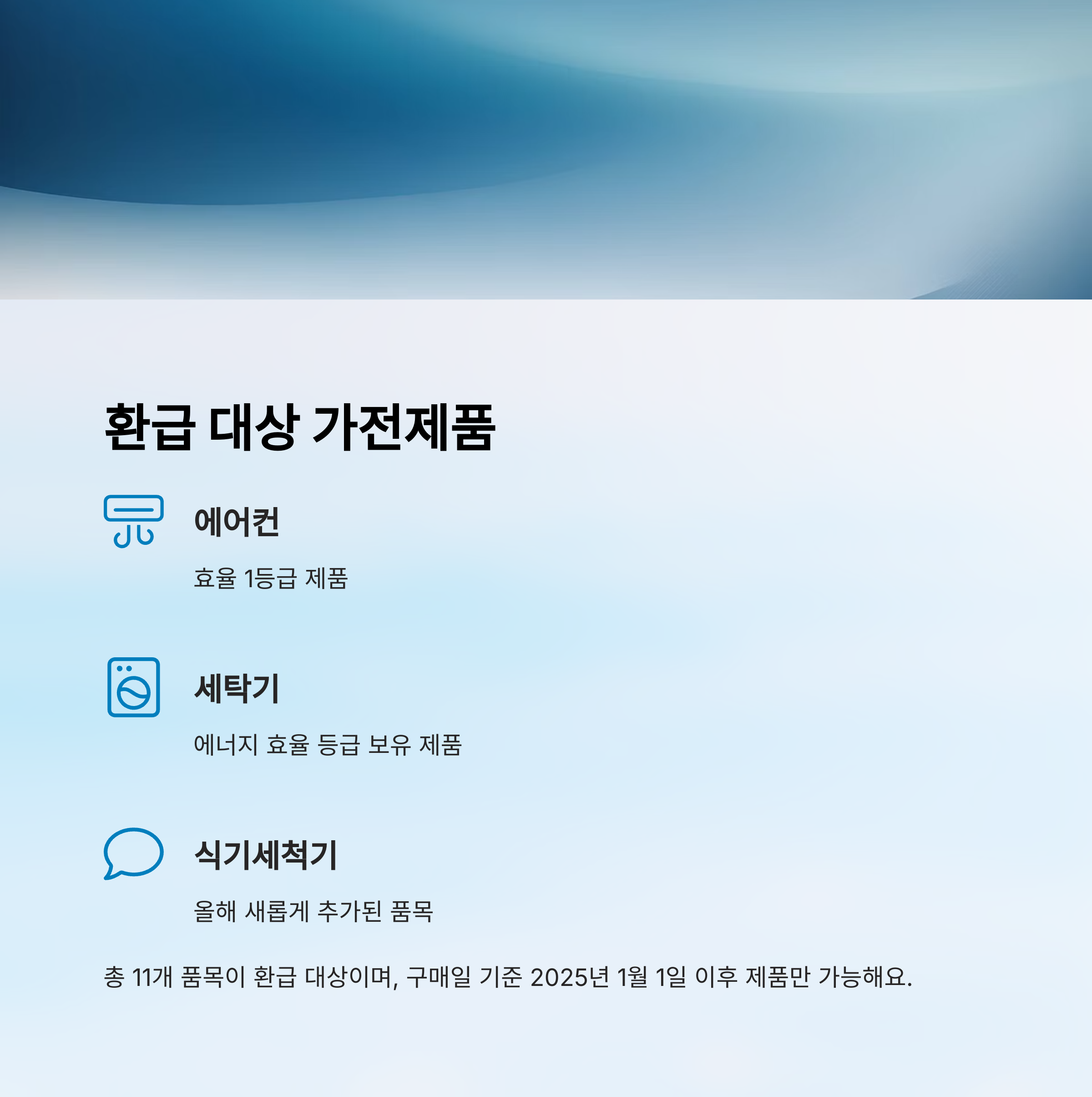 올해부터는 식기세척기도 새롭게 환급 품목에 포함됐고, 기존 10개 품목과 합쳐 총 11개 품목이 대상이 되었어요. 고효율 TV, 세탁기, 김치냉장고 등 흔히 쓰는 제품이 대부분 포함되어 있어요.
