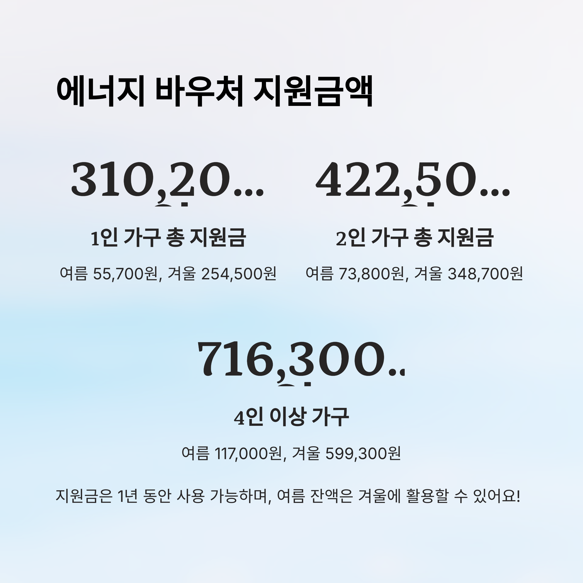 예산은 1인 가구 기준 여름 55,700원, 겨울 254,500원이며 가구원 수에 따라 지원액이 늘어나요. 특히 유동적으로 계절 간 전환도 가능해서 여름 잔액을 겨울에 쓰거나, 겨울 지원을 앞당겨 여름에 쓰는 것도 가능하답니다.