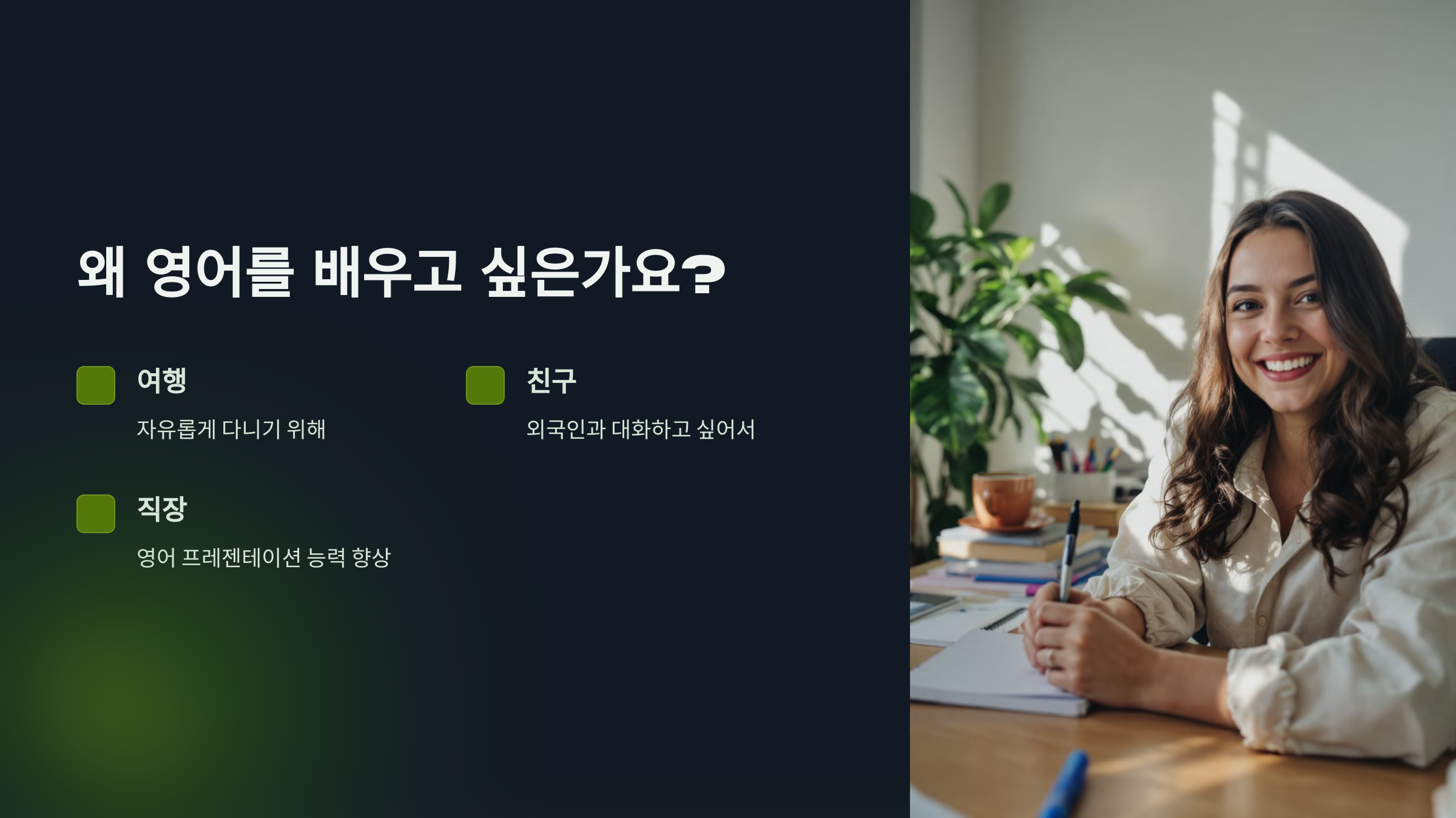 영어 공부를 시작하기 전에, 왜 영어를 배우고 싶은지 명확히 해보세요. 이유가 명확하면 학습 동기가 생기고, 더 꾸준히 공부할 수 있습니다.