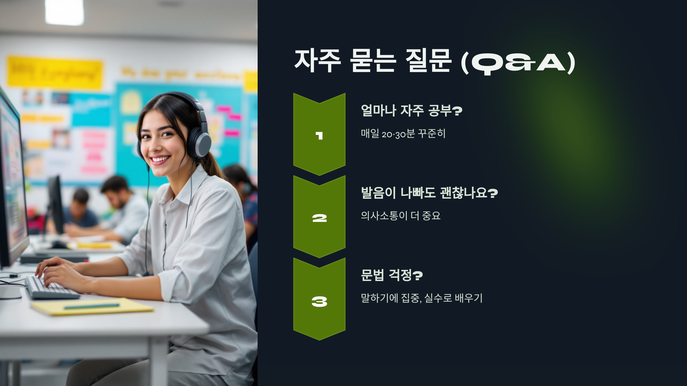 A3: 초반에는 문법보다 말하는 데 집중하세요. 실수를 통해 배우는 것이 더 효과적입니다.