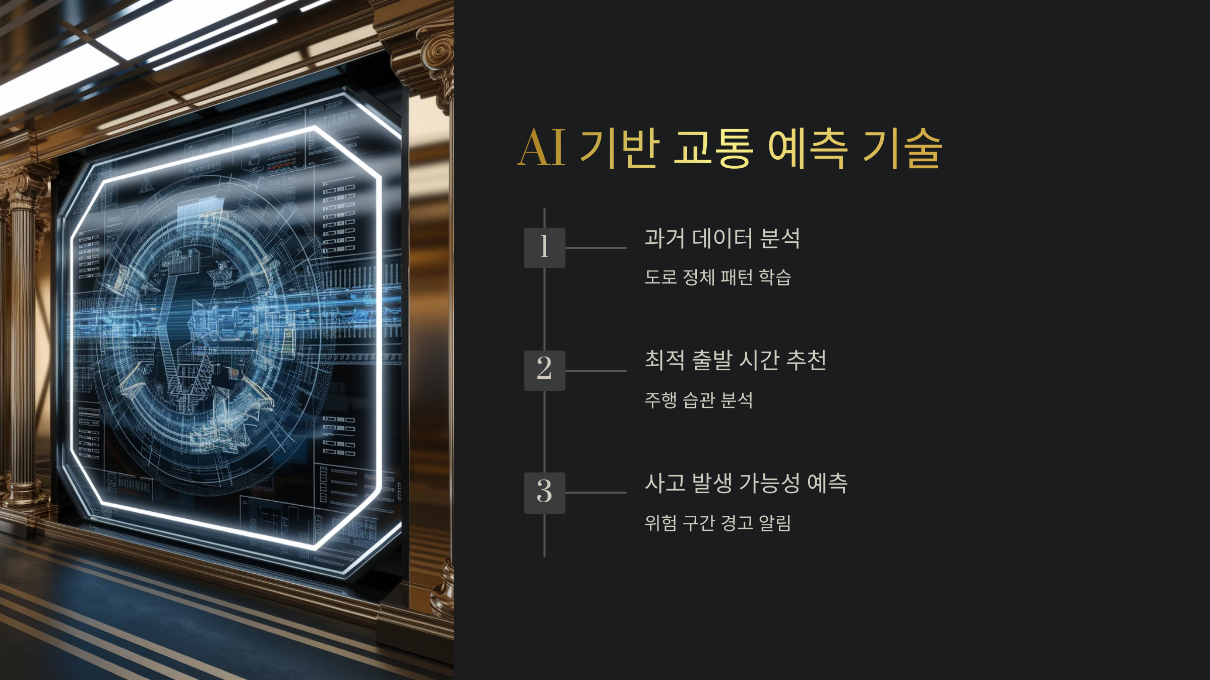 AI 기술은 과거 데이터를 분석하여 미래의 교통 흐름을 예측하는 데 활용돼요. 머신러닝 알고리즘이 도로 정체 패턴을 분석하고, 특정 시간대에 어떤 도로가 막힐 가능성이 높은지 미리 예측할 수 있어요.