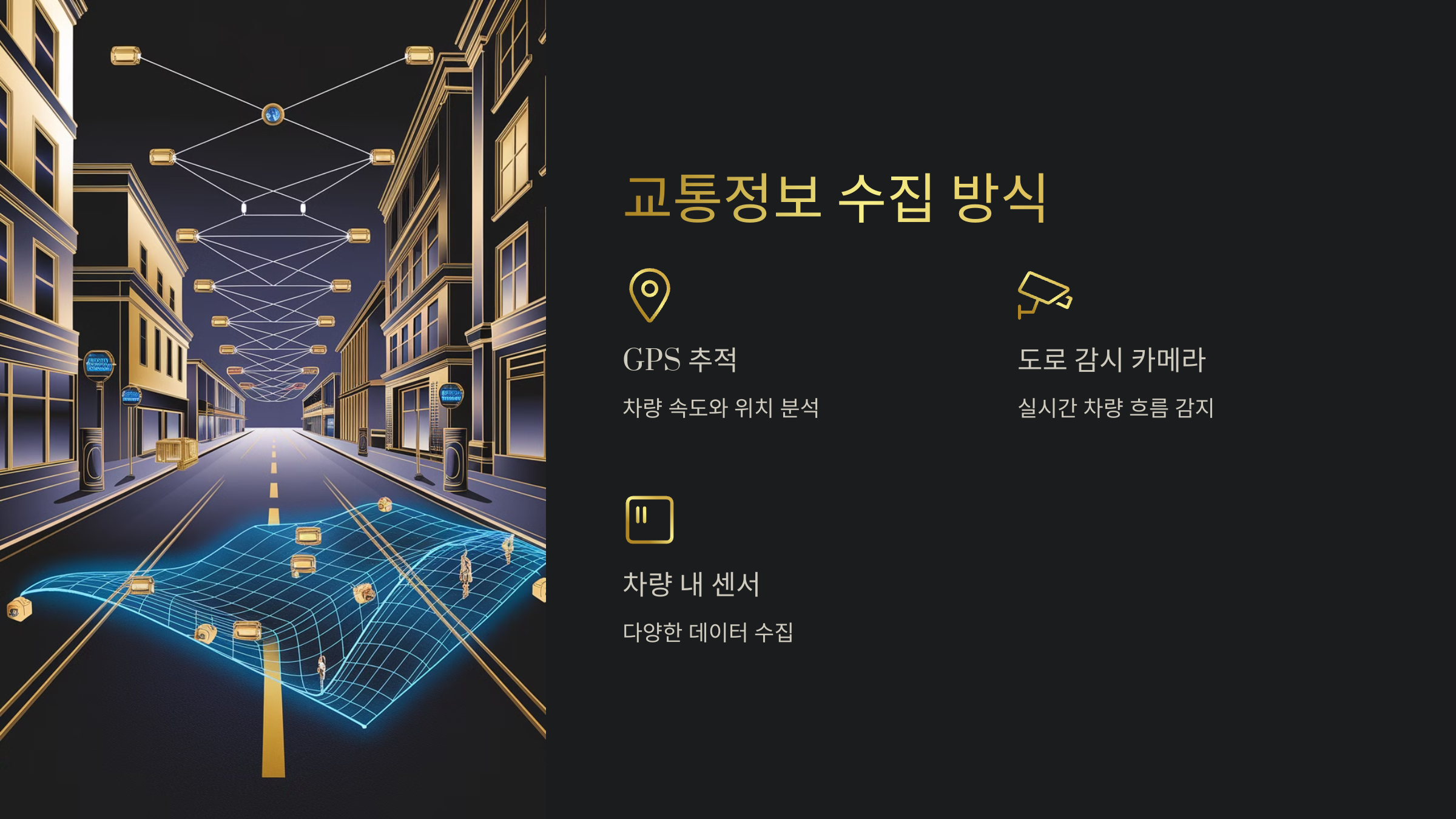 실시간 교통정보는 여러 가지 방법으로 수집돼요. 대표적으로 GPS 기반 차량 추적, 도로 감시 카메라, 차량 내 센서 등이 있어요.