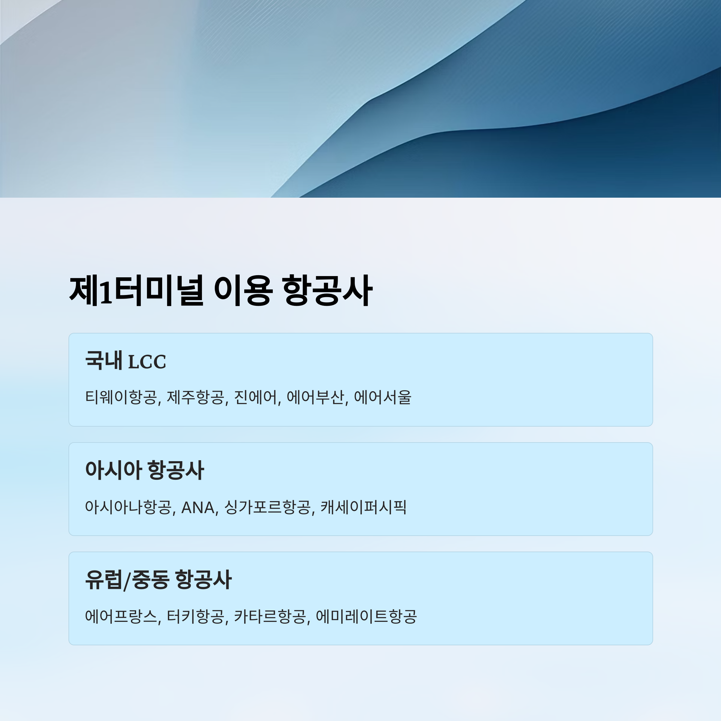 | 🛫 제1터미널 (T1) | 아시아나항공, 에어프랑스, 터키항공, 싱가포르항공, 카타르항공, ANA, 캐세이퍼시픽, 에미레이트항공, 에티하드항공, 티웨이항공, 제주항공, 진에어, 에어부산, 에어서울, 기타 외국 항공사 |